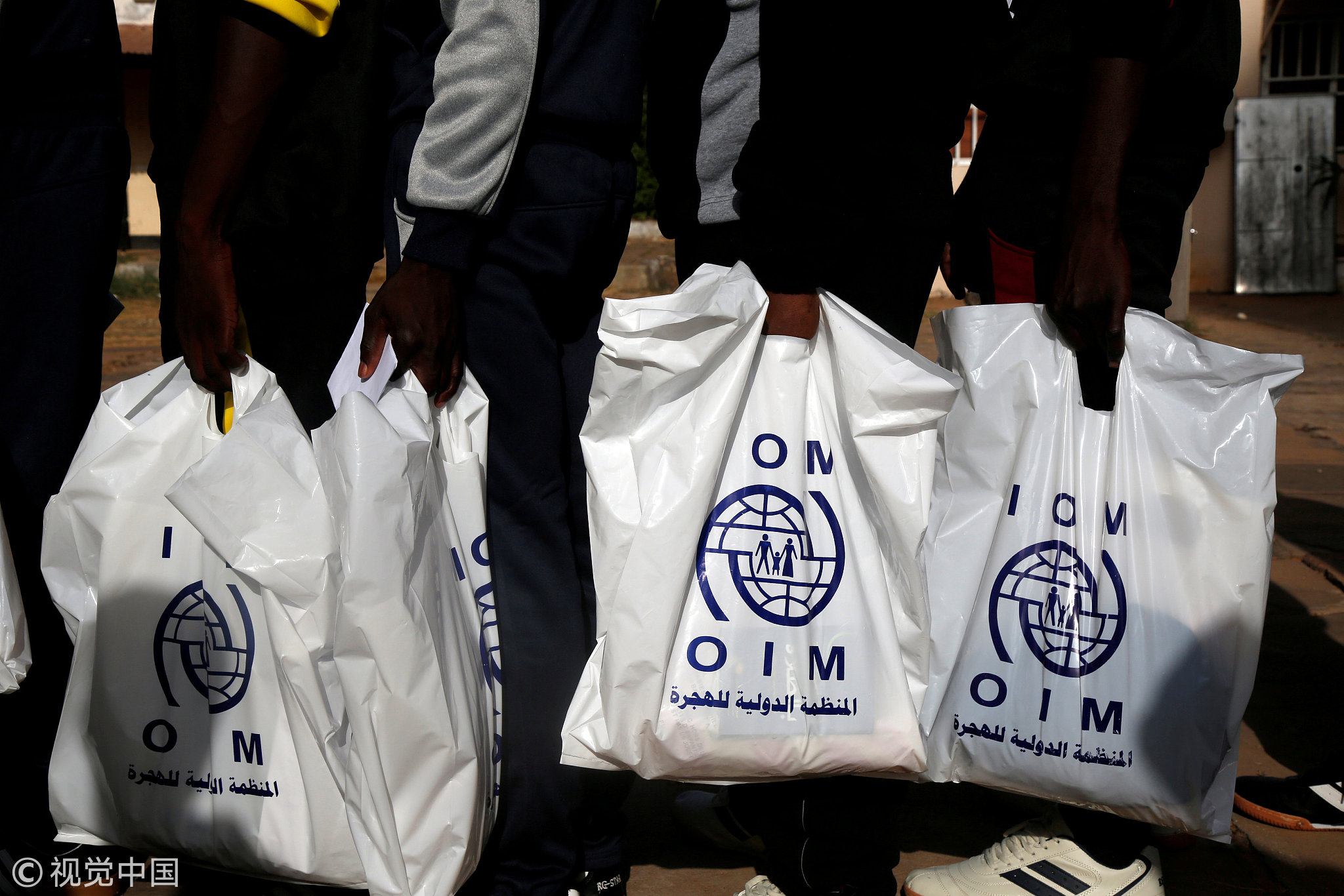 Gambian migrants deported from Libya stand in line with plastic bags from the International Organization for Migration (IOM) as they wait for registration at the airport in Banjul, Gambia April 4, 2017. /VCG Photo