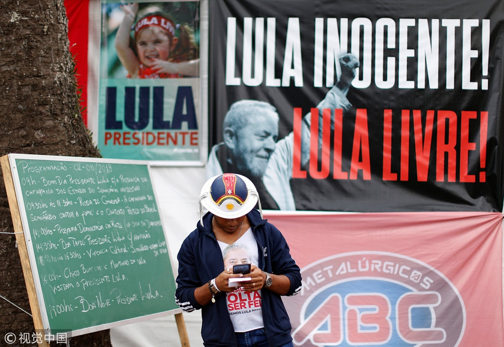 A supporter of former Brazilian President Luiz Inacio Lula da Silva checks his mobile phone in a camp near the Federal Police in Curitiba, Brazil, August 2, 2018. /VCG Photo