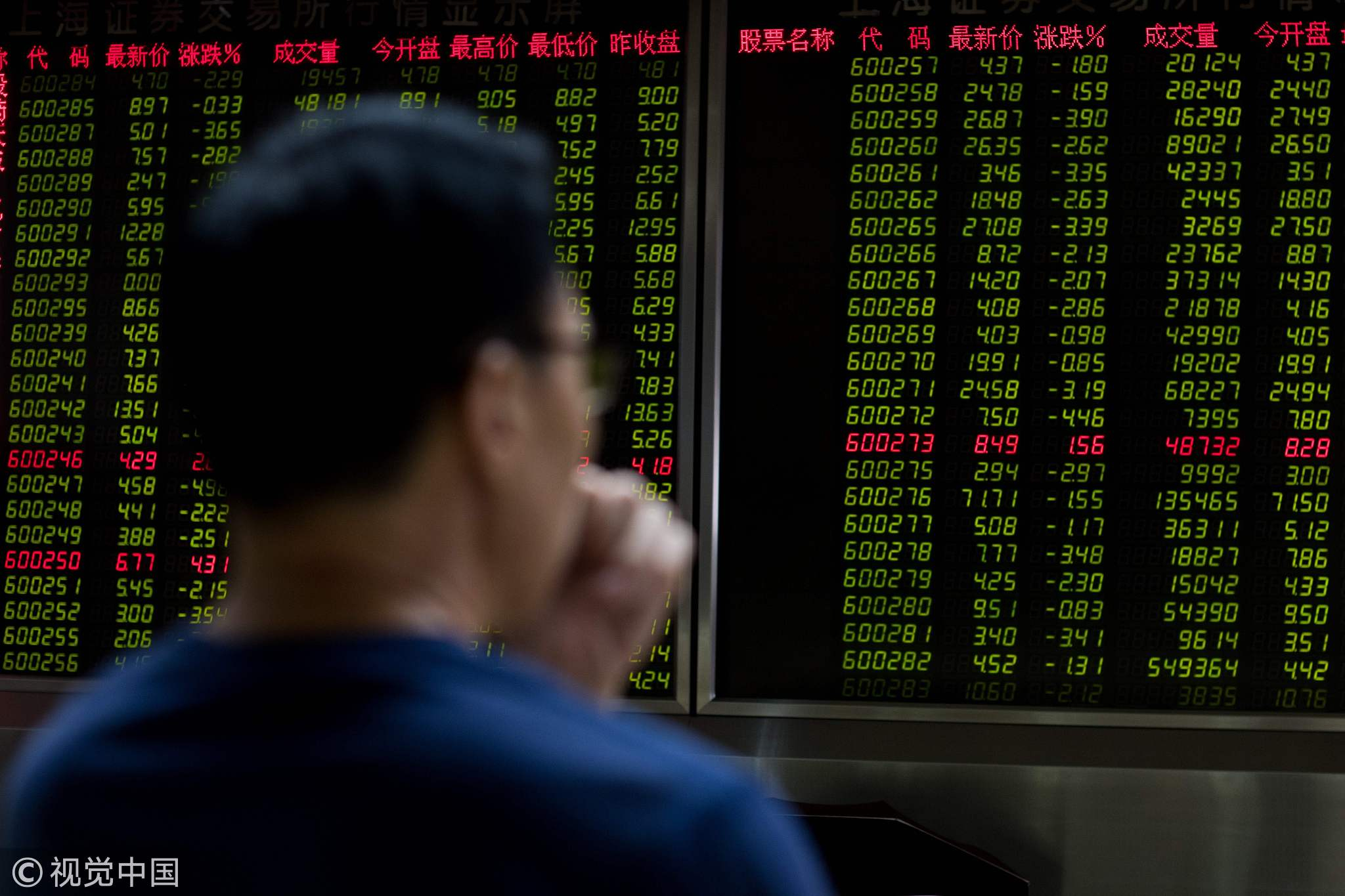 A man sits in front of a screen showing stock prices at a securities company in Beijing, July 11, 2018. /VCG Photo