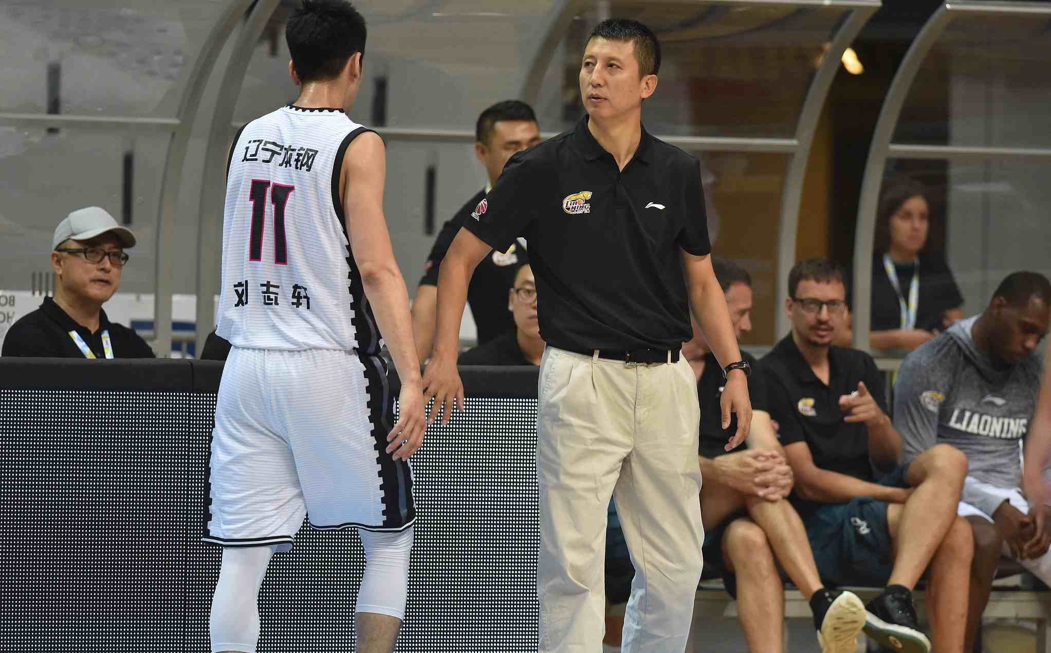 Liaoning Flying Leopards head coach Guo Shiqiang (R) talks with his squad player Liu Zhixuan during their match with CSKA Moscow in Zadar, Croatia, Sept. 20, 2018. /VCG Photo