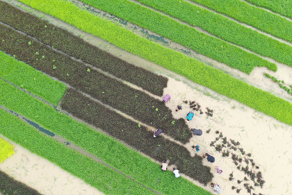 Farmers work on the field in Hunan Province