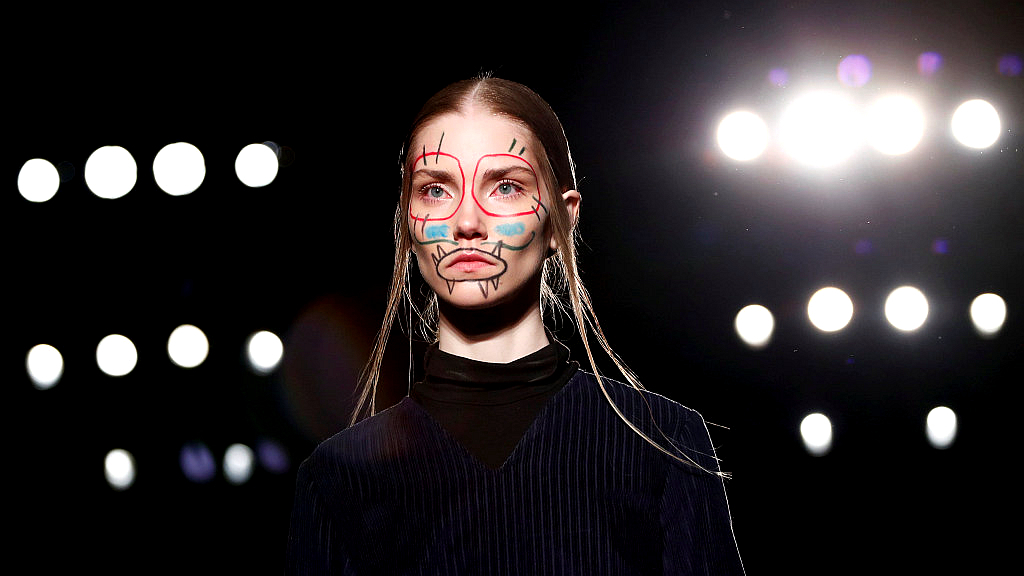 The models' makeup nodded to Ramalho's work with large circles around their eyes and teeth drawn on their faces. They wore jackets, coats and dresses with clashing prints – like tartan and pinstripe – with multiple layers from head to toe.