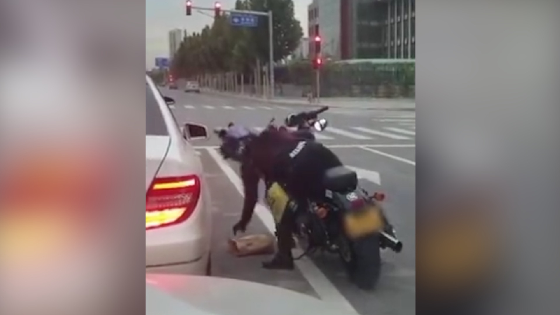 A video has captured the moment when a female motorcyclist picked up a garbage bag that thrown out by a driver in Beijing and threw it back inside the vehicle.