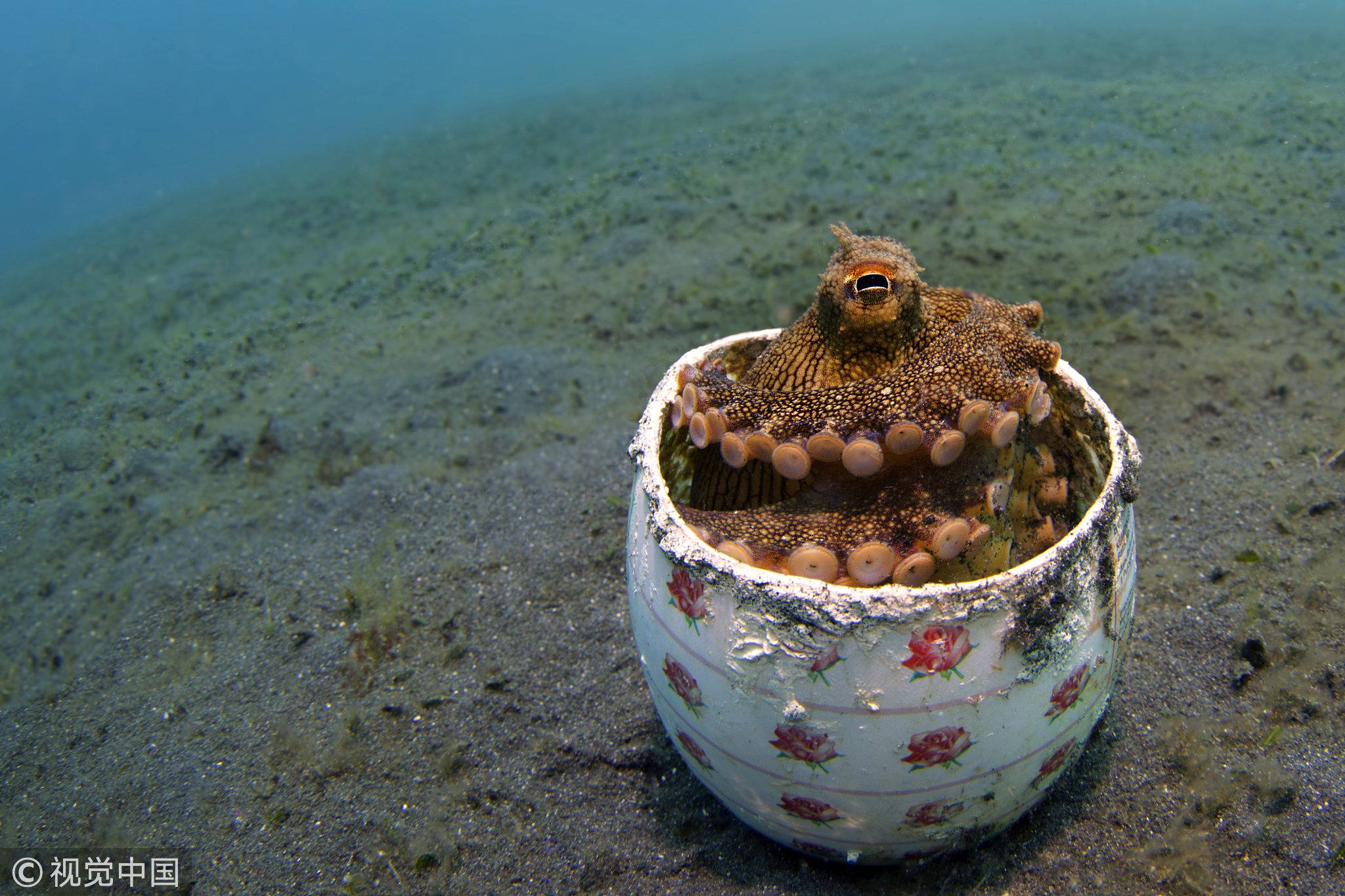 An octopus settles neatly in a discarded soap dish underwater off Lembeh, North Sulawesi, Indonesia. /VCG Photo