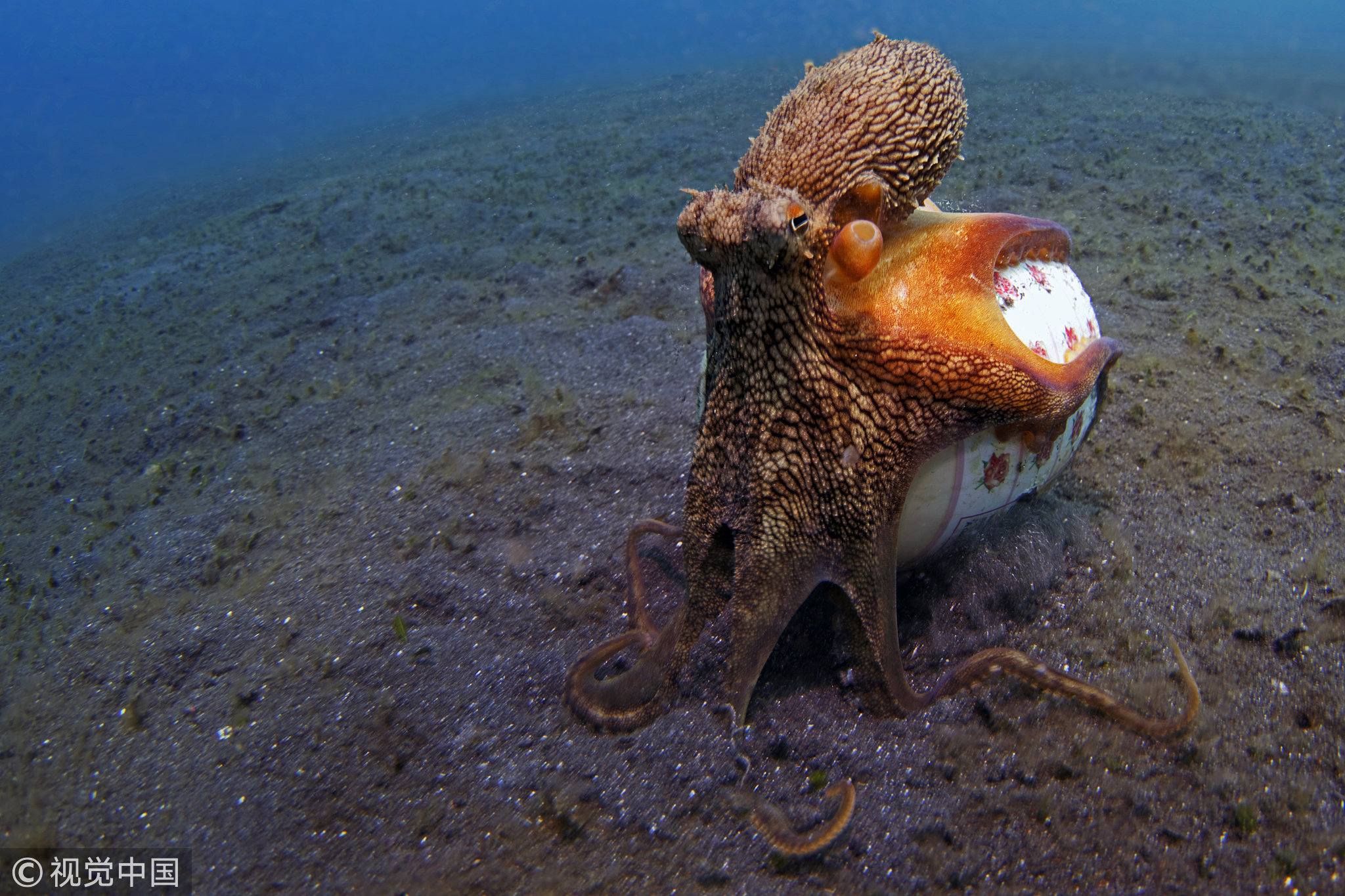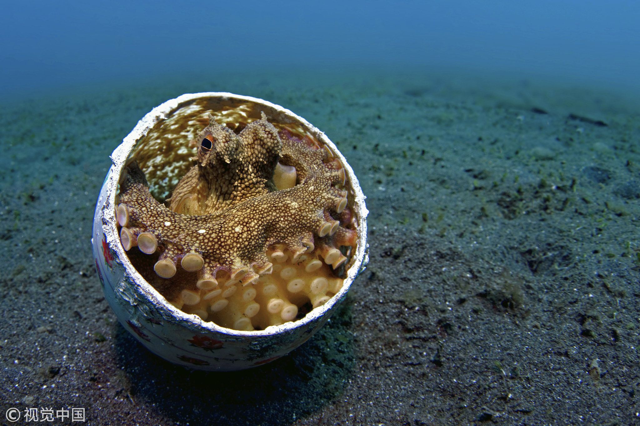 The octopus wrapped its body in the discarded soup dish as it was a regular home. /VCG Photo