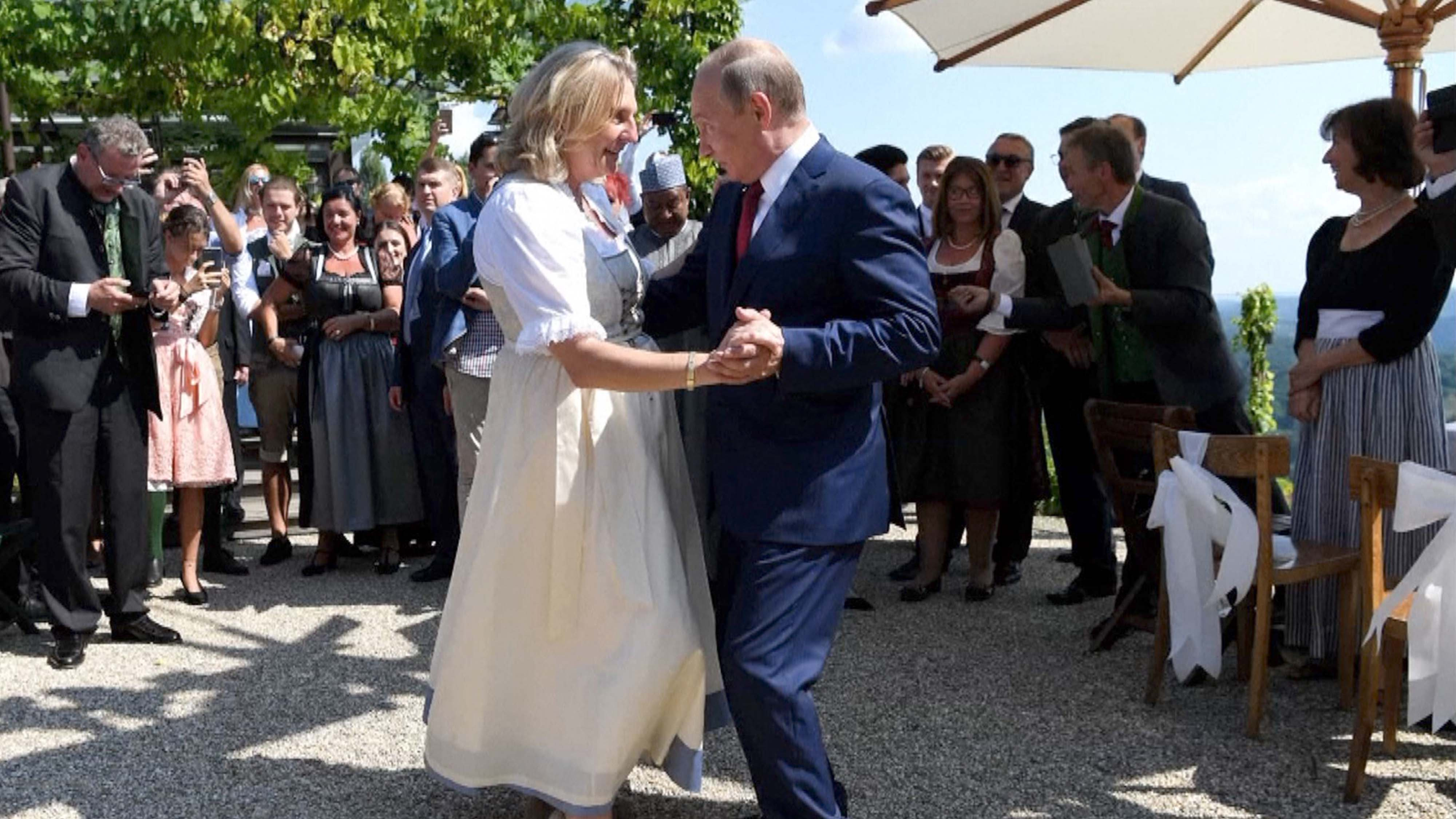 Russian President Vladimir Putin made a flying visit to Austria to attend the wedding of the country's foreign minister on Saturday. Putin danced with the bride, who was dressed in a traditional Austrian costume.