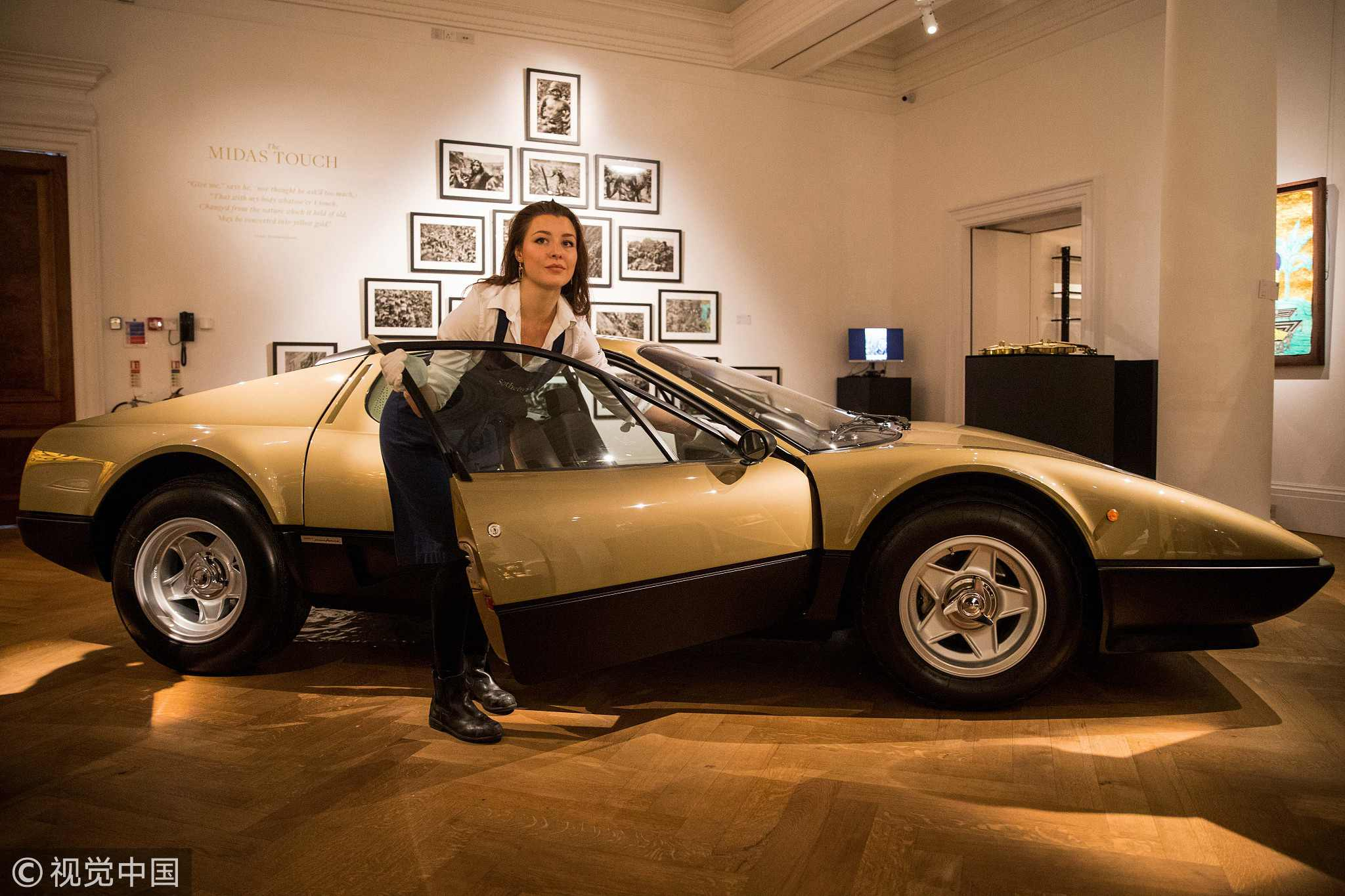 An employee poses with a metallic gold 1977 Ferrari 512 BB during a preview of "The Midas Touch" auction in London, UK. /VCG Photo