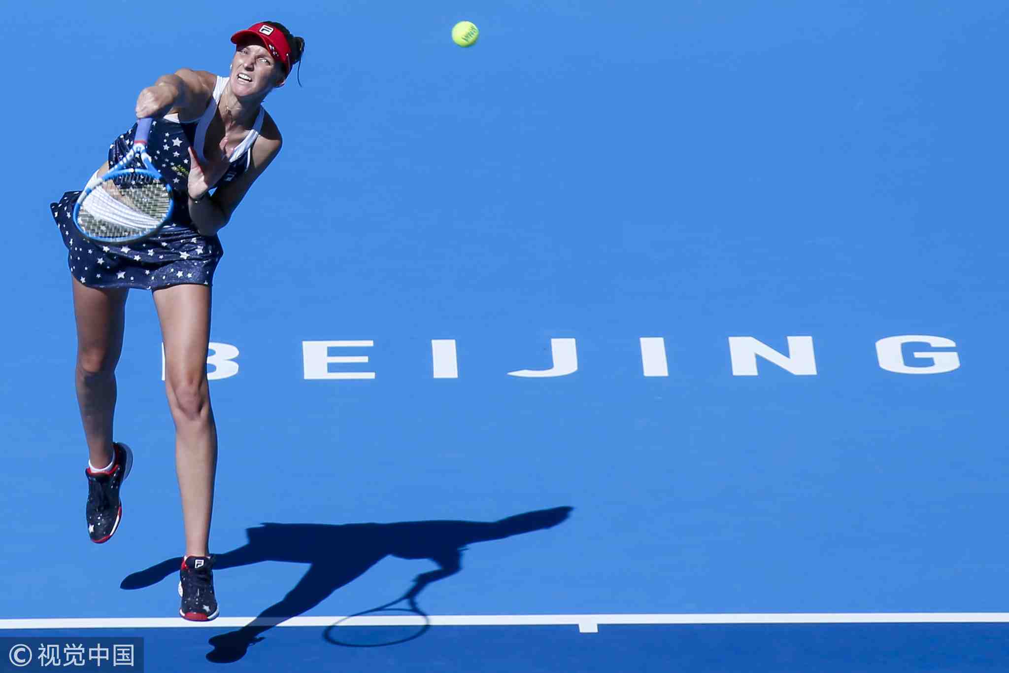 Karolina Pliskova of the Czech Republic serves to Aliaksandra Sasnovich (not pictured) of Belarus during their women's singles match of China Open at the China National Tennis Centre in Beijing, October 3, 2018. /VCG Photo
