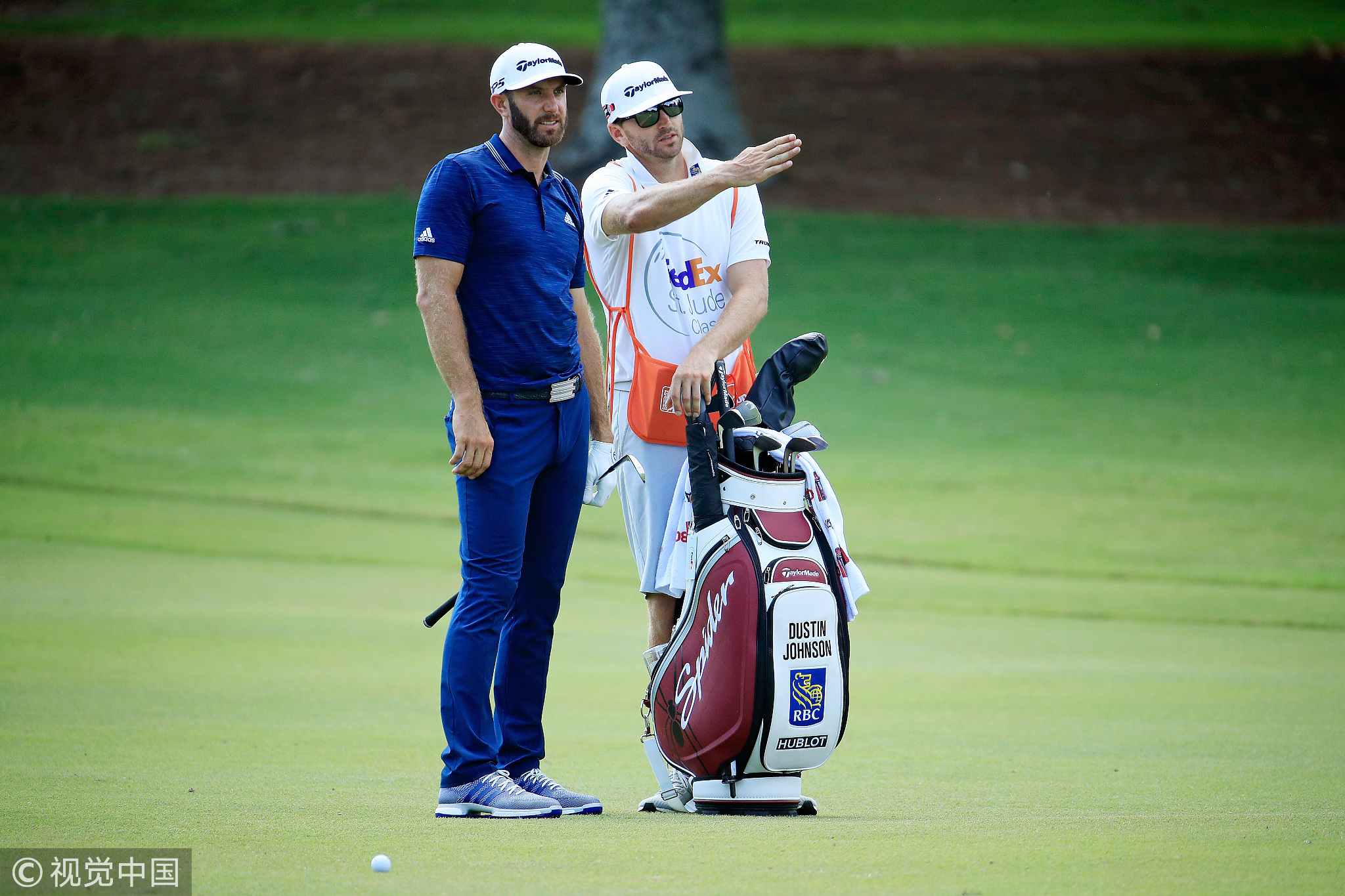June 10, 2018: Dustin Johnson stands with his caddie during the final round of the FedEx St Jude Classic at TPC Southwind in Memphis, Tennessee. /VCG Photo