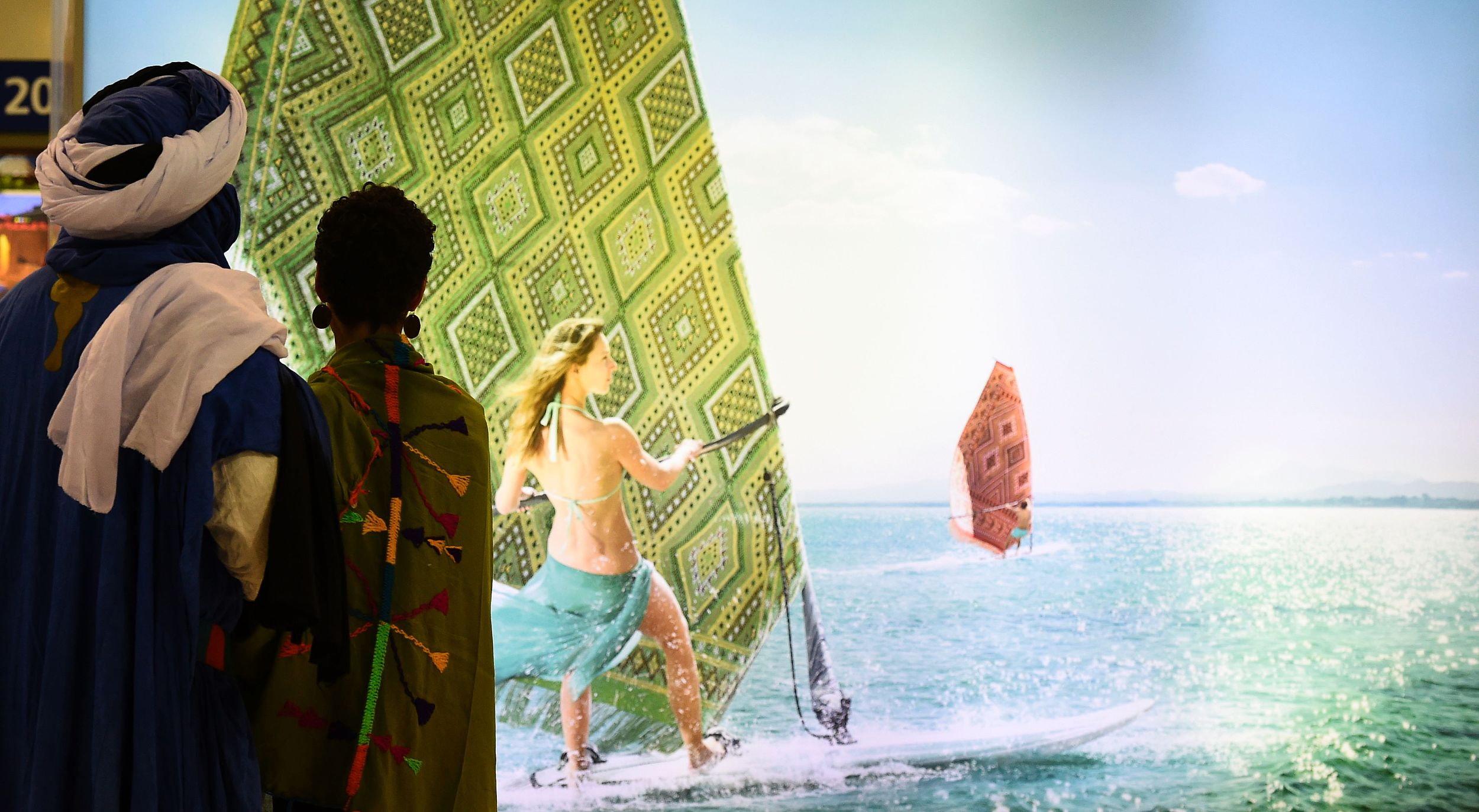 Visitors look at a promotion banner at the booth of Tunisia at the International Tourism Fair ITB in Berlin, March 10, 2016. /VCG Photo