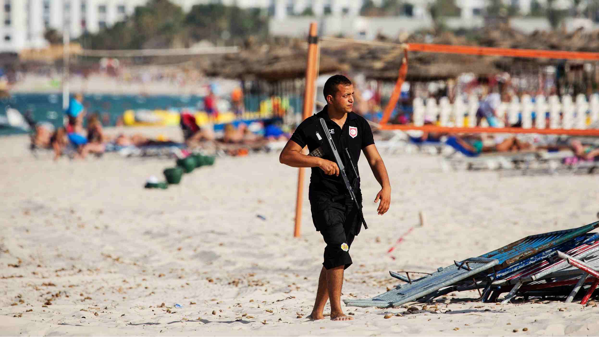 A policeman is seen patrolling the beach ahead of a memorial service for the victims of the 2015 Sousse Beach terrorist attack on June 26, 2016, in Sousse, Tunisia. /VCG Photo