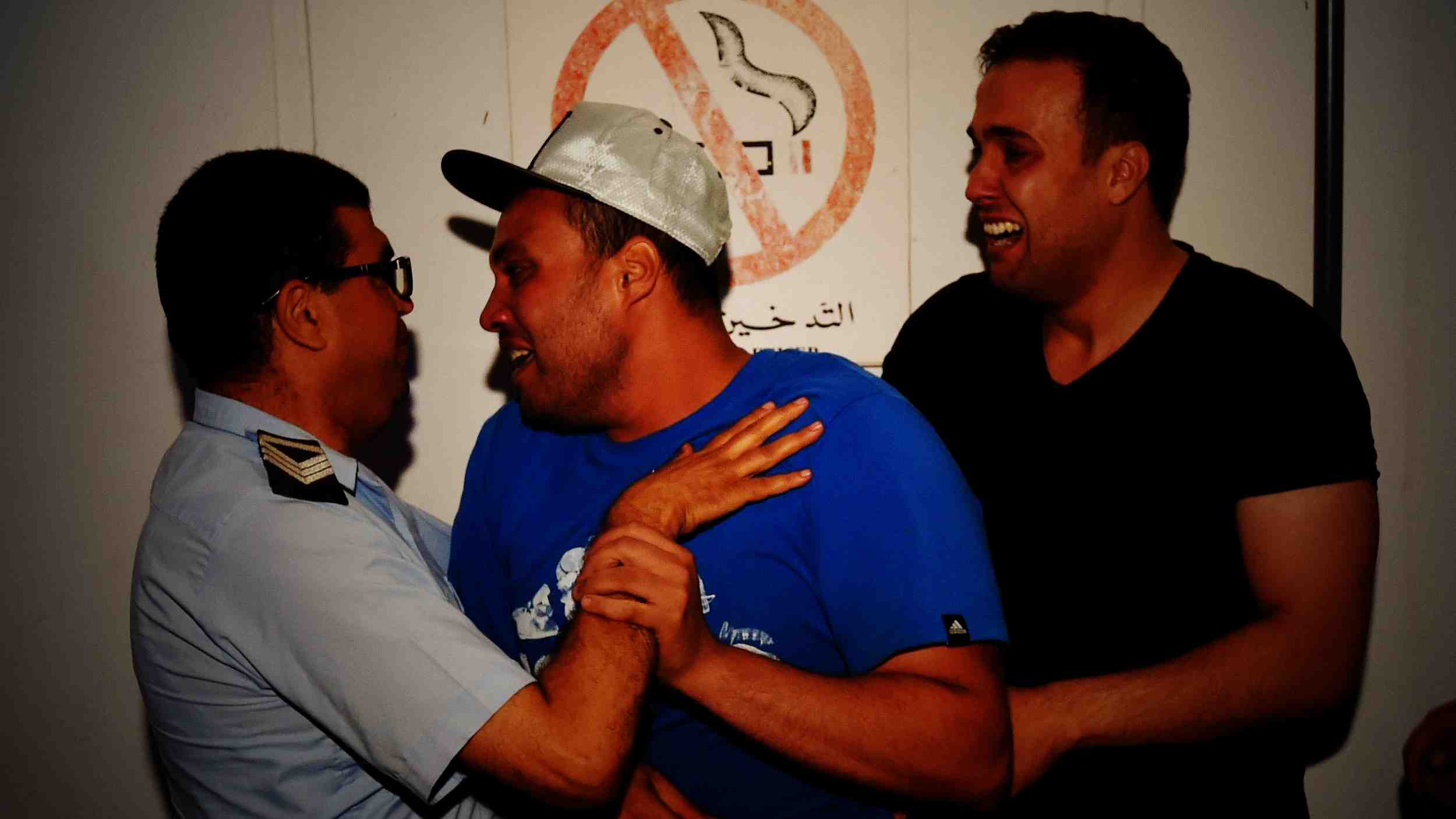 Colleagues of a Tunisian member of the security forces, who was killed in a terrorist landmine ambush in the Ain Sultan area of the Jenduba border province, react as his body is transported to Charles Nicole hospital in the capital Tunis, July 8, 2018. /VCG Photo