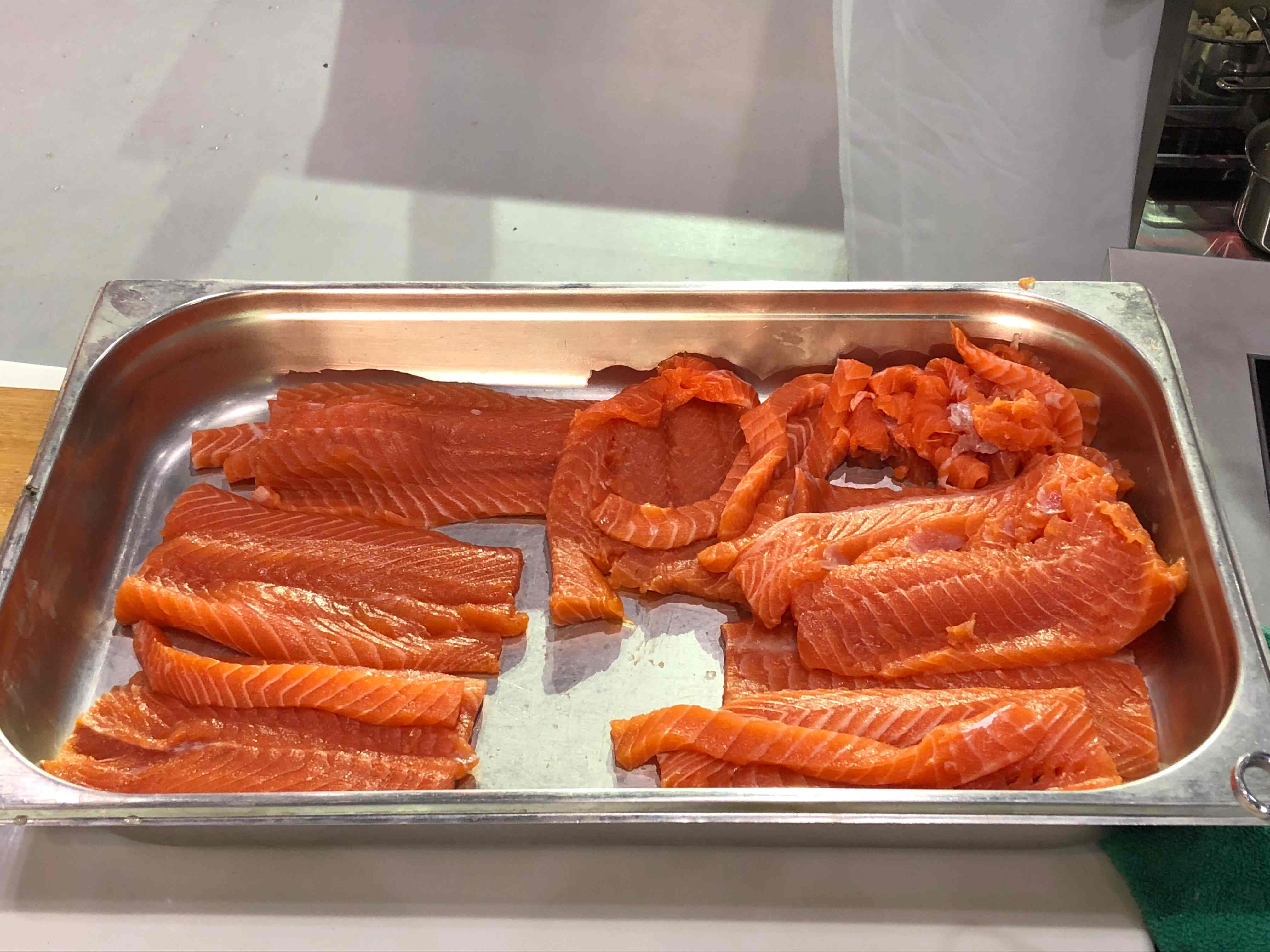 Atlantic salmon awaiting seasoning and cooking. /CGTN Photo