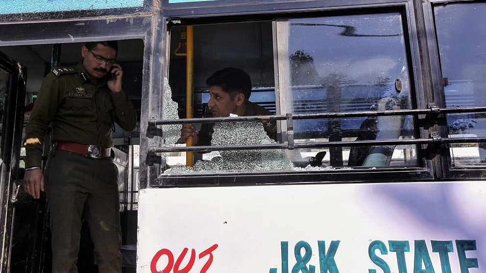 Indian police inspect a damaged bus at the site of a grenade blast at a bus station in Jammu on March 7, 2019. /VCG Photo