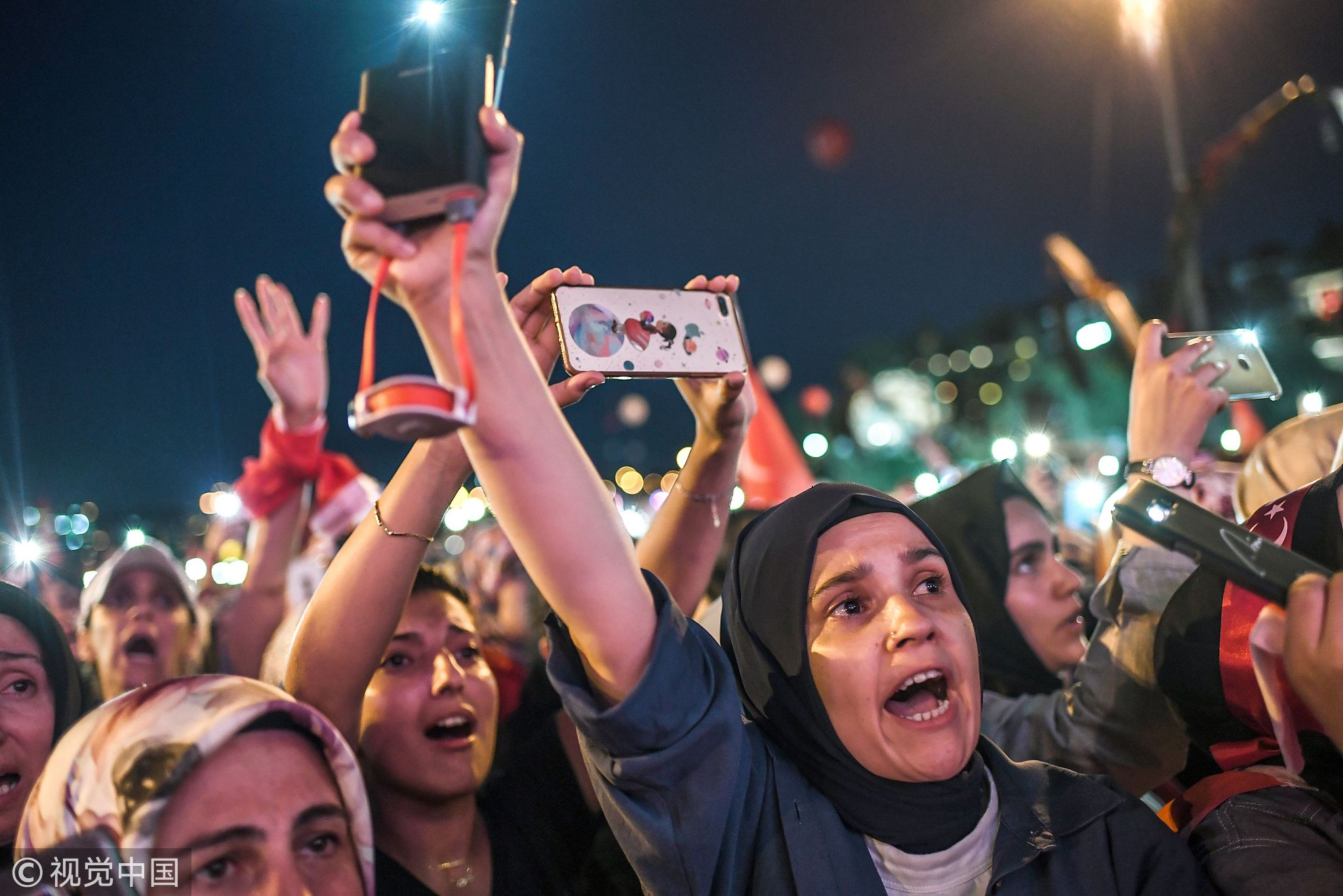 Turkey's President Recep Tayyip Erdogan delivers a speech at the "15 July Martyrs Bridge" (Bosphorus Bridge) in Istanbul, July 15, 2018. /VCG Photo