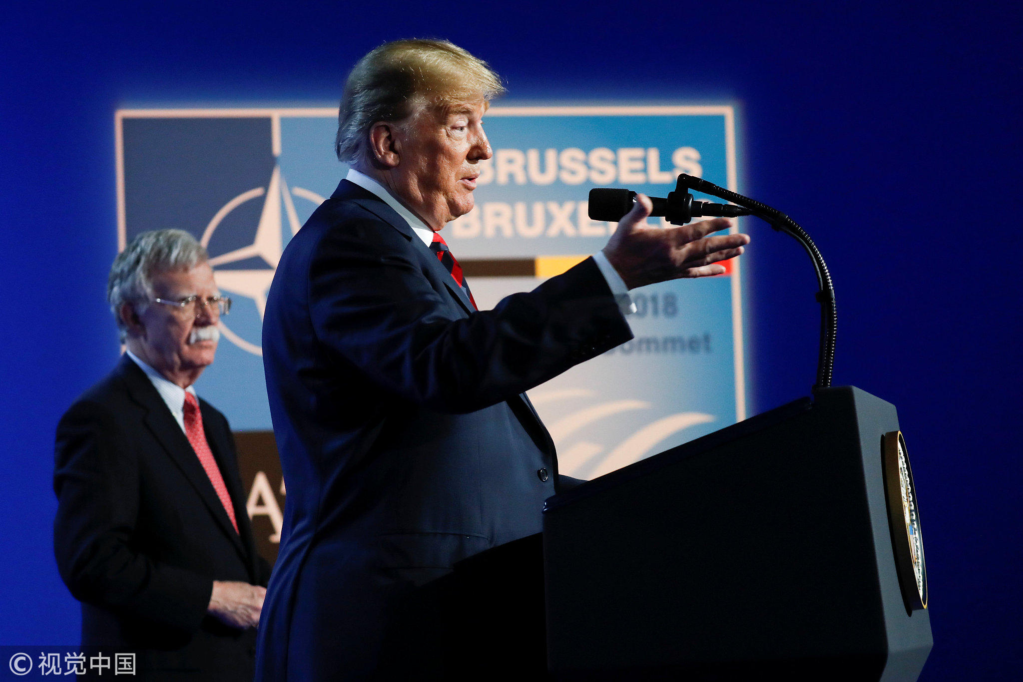 US National Security Adviser John Bolton looks on as US President Donald Trump holds a news conference after participating in the NATO Summit in Brussels, Belgium July 12, 2018. /VCG Photo