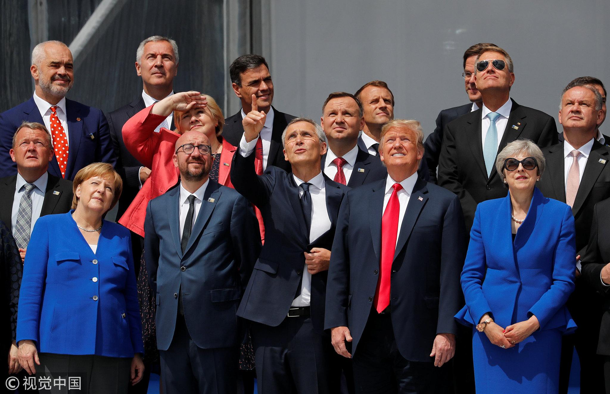 NATO leaders observe a helicopter fly past at the start of the NATO summit in Brussels, Belgium July 11, 2018. /VCG Photo