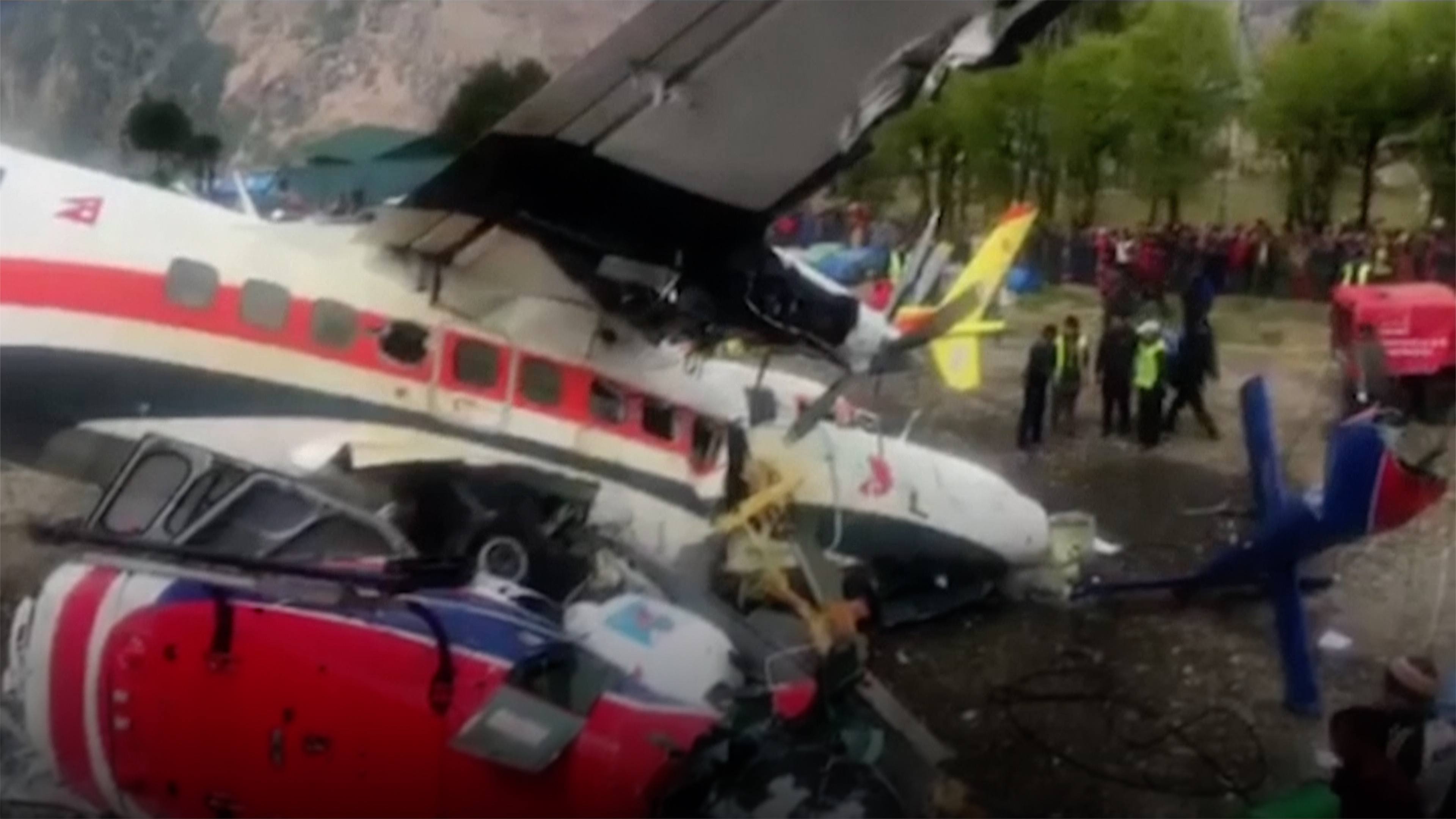 The Twin Otter aircraft crashed into the helicopter at Tenzing Hillary Airport at Lukla, known as the gateway to the world's highest mountain, 125 kilometers (78 miles) northeast of capital Kathmandu.
