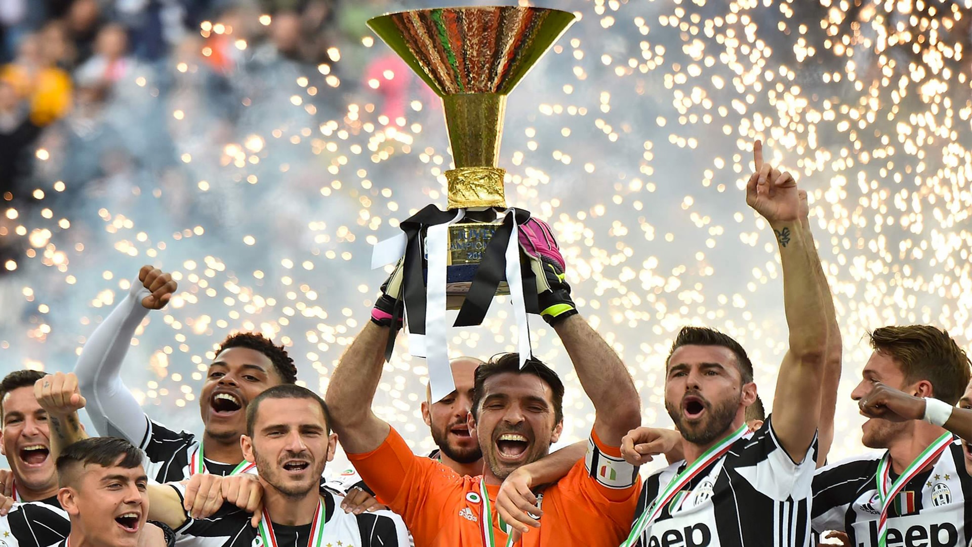 Juventus' goalkeeper Gianluigi Buffon (C) from Italy and Juventus' players celebrate their Serie A title after the Italian Serie A football match Juventus vs Sampdoria, May 14, 2016, at the "Juventus Stadium" in Turin. /VCG Photo