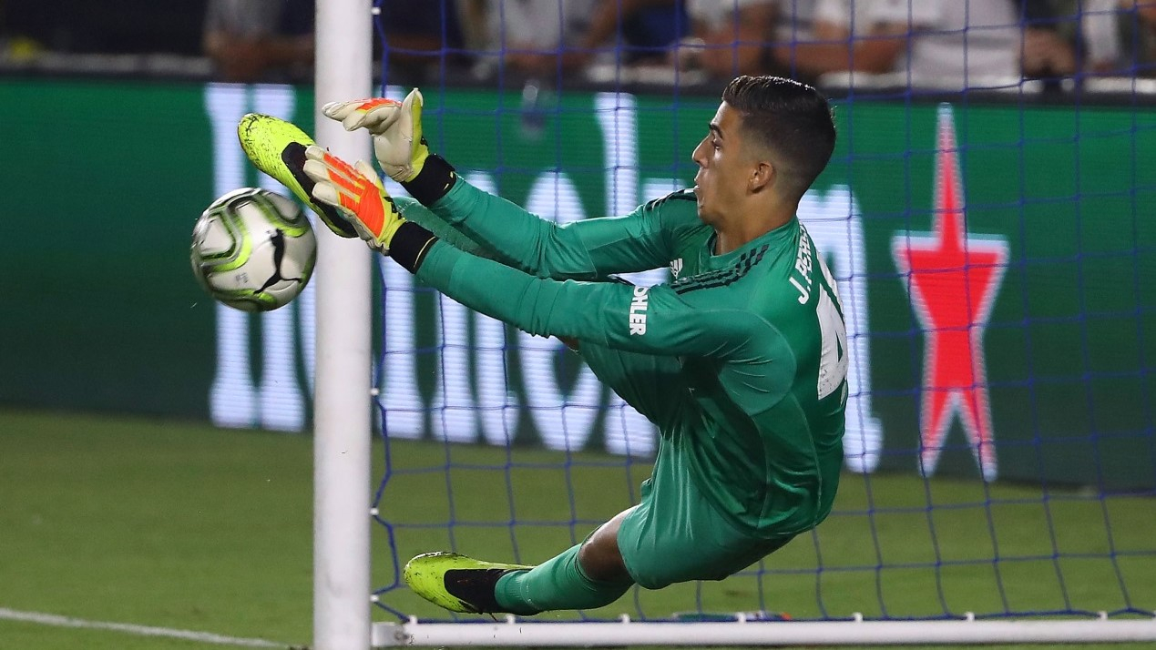 Goalkeeper Joel Pereira of Manchester United makes a save during the penalty shootout against the AC Milan. /VCG Photo
