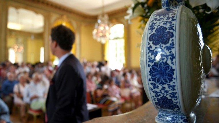 The round-shaped moon flask has eight Buddhist symbols in stylized lotus petals and bears the seal of the emperor. It was discovered by chance in April in a French castle during a valuation of antiques and its original owners remain anonymous.