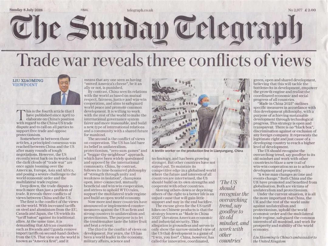 The Sunday Telegraph publishes a signed article by Ambassador Liu Xiaoming entitled "The trade war reveals three conflicts of views." /Photo from China's embassy in the UK