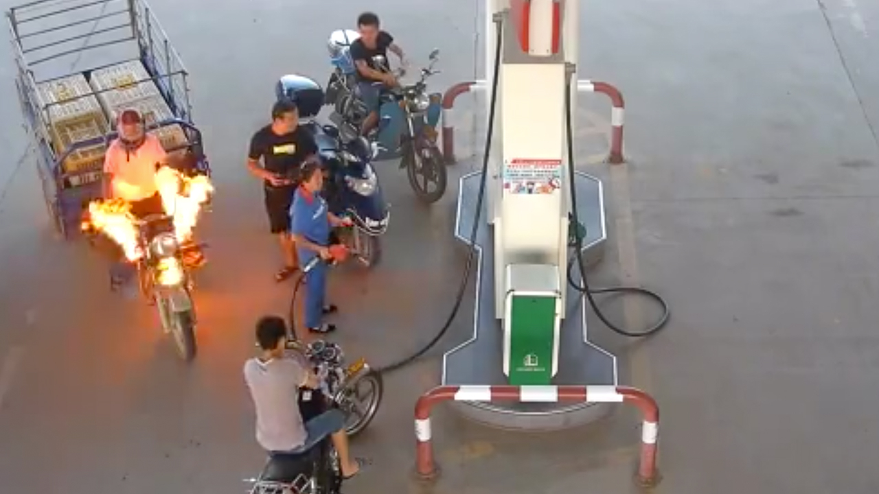 A tricycle at a gas station caught fire as the driver was starting the engine in Ji’an City, east China’s Jiangxi Province on July 9. A female employee immediately picked up a fire extinguisher and put it out in 12 seconds.