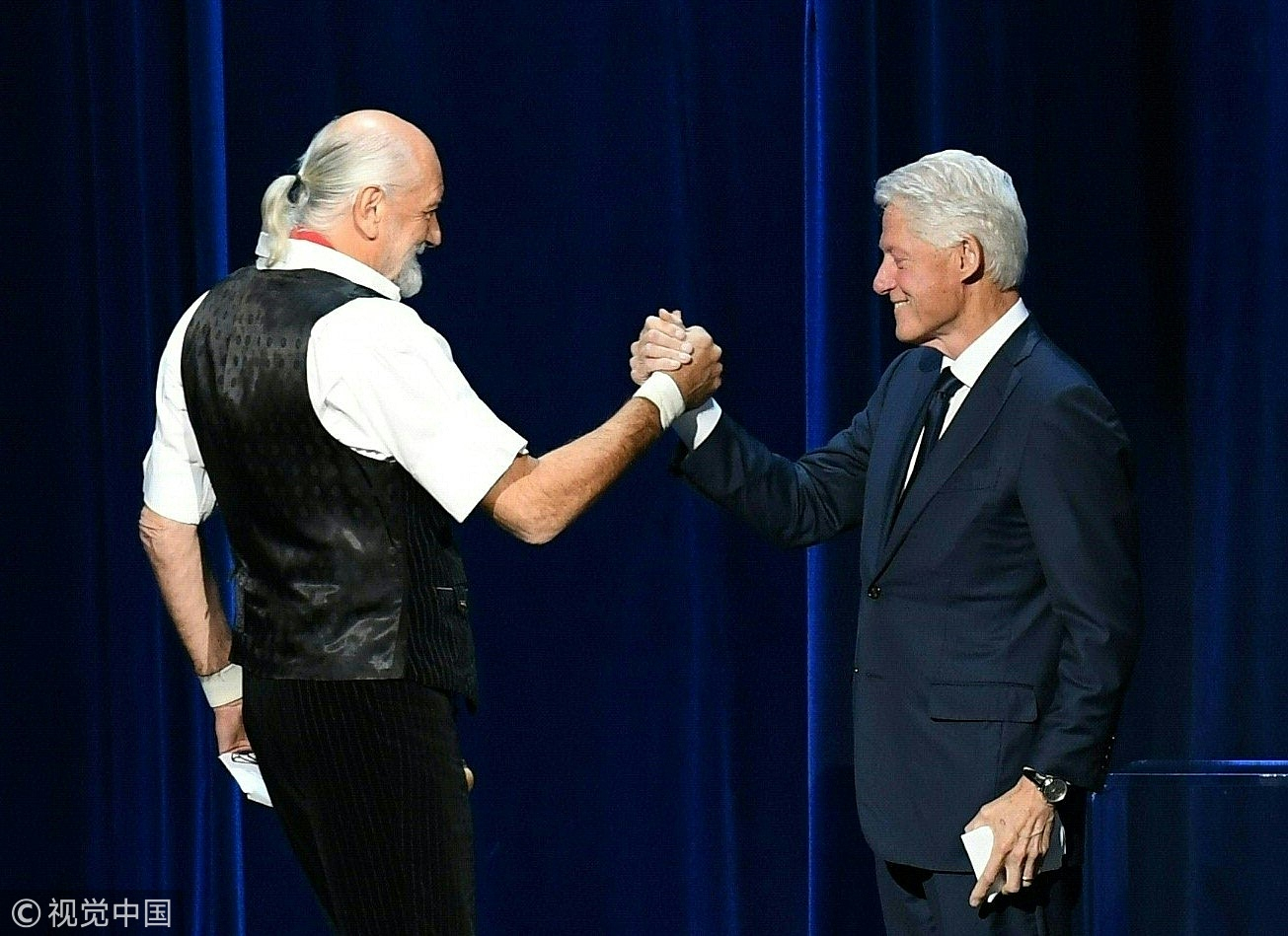 Former US President Bill Clinton (R) greets Mick Fleetwood from the band Fleetwood Mac on stage at the 2018 MusiCares Person Of The Year gala at Radio City Music Hall in New York on January 26, 2018. /VCG Photo