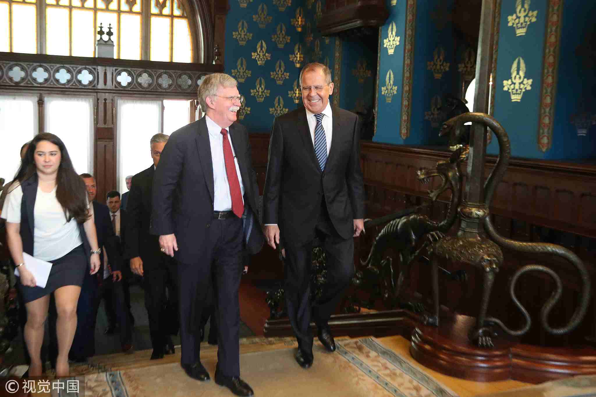 Russian Foreign Minister Sergei Lavrov (R) and US national security adviser John Bolton arriving at the Kremlin before talks in Moscow, June 27, 2018 /VCG Photo