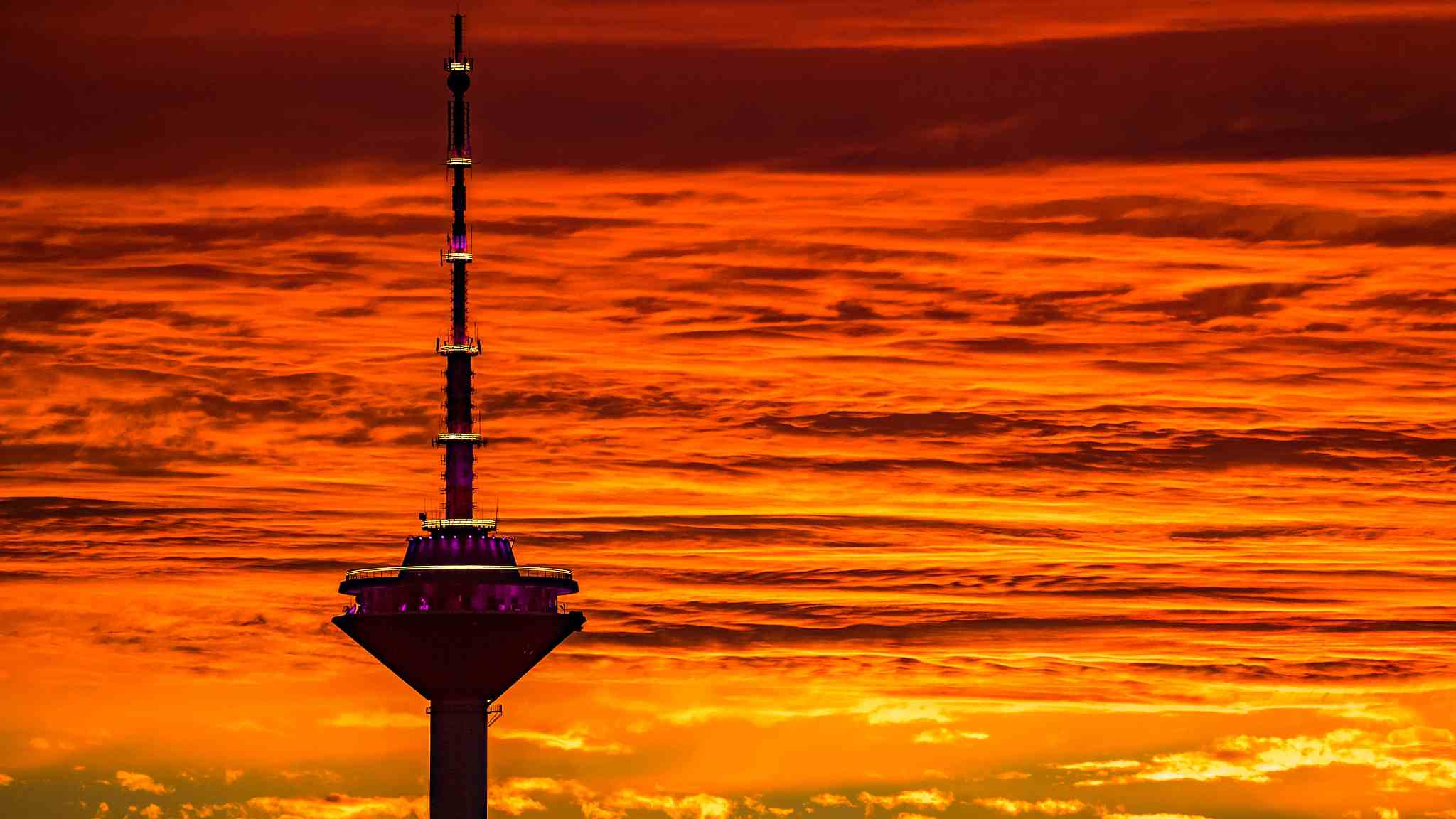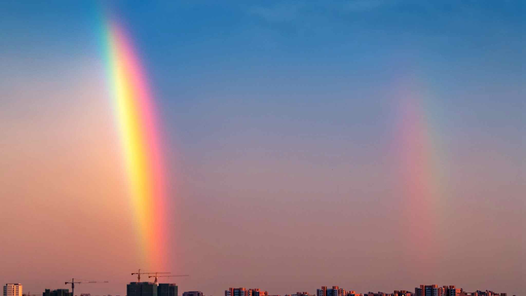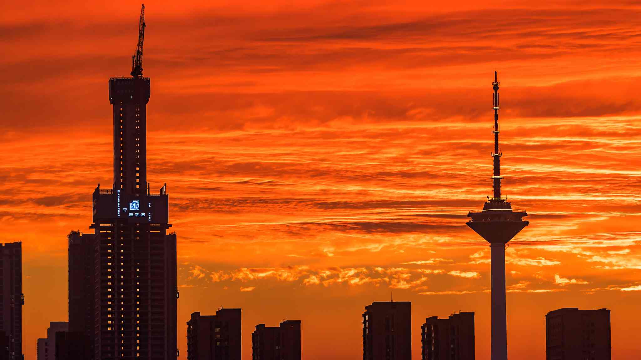 By dusk on August 23, both a sunset glow as well as rainbows made their stunning appearance, tinting the sky in a layer of orange, and silhouetting the landmark Liaoning Radio and TV Tower with a picturesque background. /VCG Photo.