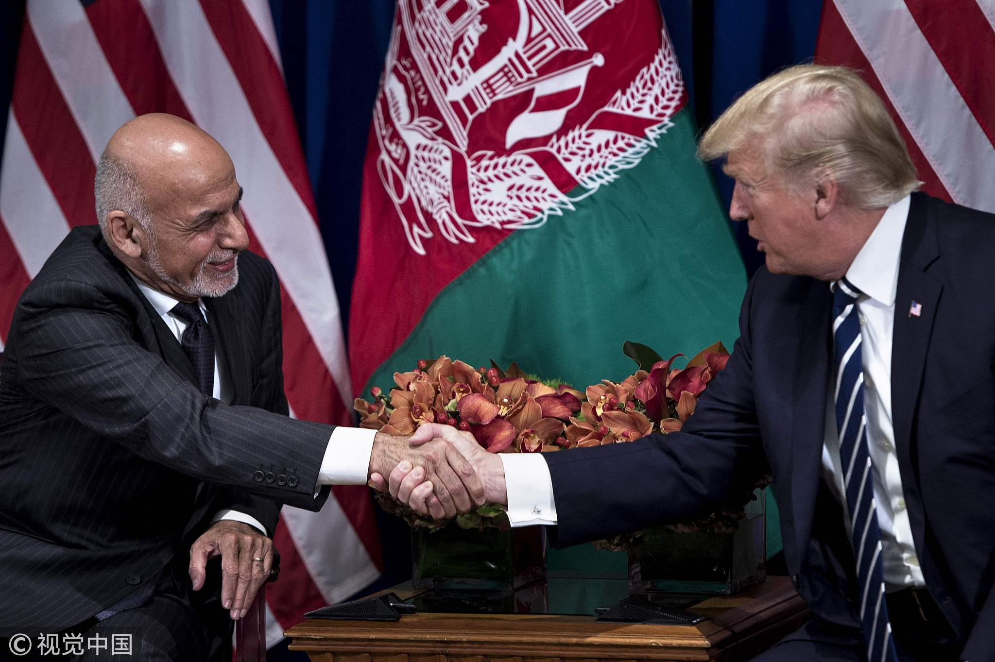 Afghan President Ashraf Ghani and US President Donald Trump shake hands before a meeting at the Palace Hotel during the 72nd United Nations General Assembly in New York, September 21, 2017. /VCG Photo