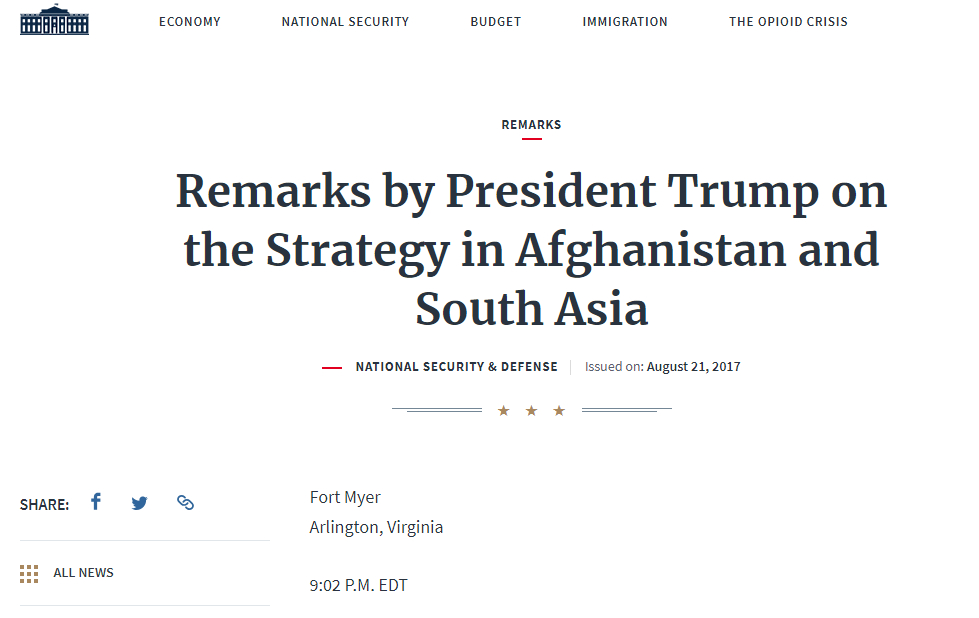 In the remarks on the Strategy in Afghanistan and South Asia, Trump also showed his concerns to security threats, noting the threats in Afghanistan and the broader region are immense.