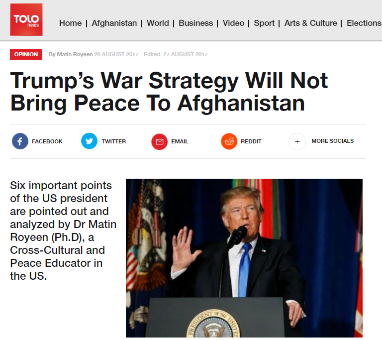 After Trump announced the strategy, Royeen opined on TOLOnews, an Afghan news network, with a headline "Trump's War Strategy Will Not Bring Peace To Afghanistan."