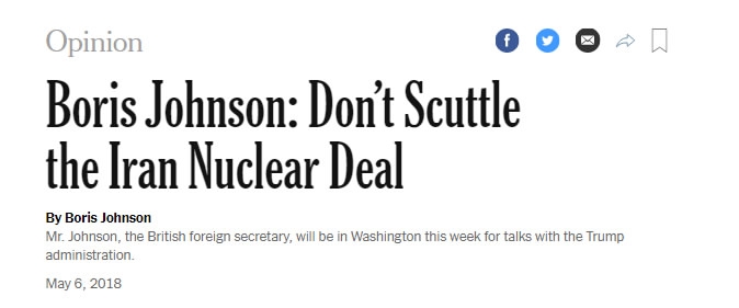 "At this delicate juncture, it would be a mistake to walk away from the nuclear agreement and remove the restraints that it places on Iran," Johnson wrote in the Times piece.