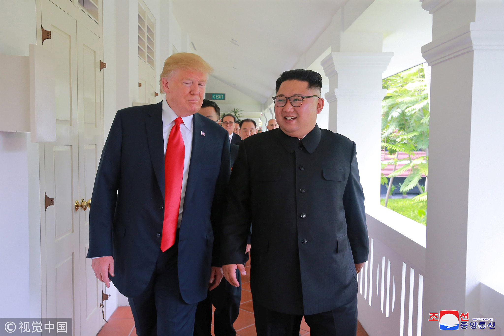 US President Donald Trump walks with DPRK leader Kim Jong Un at the Capella Hotel on Sentosa island in Singapore, June 12, 2018. /VCG Photo