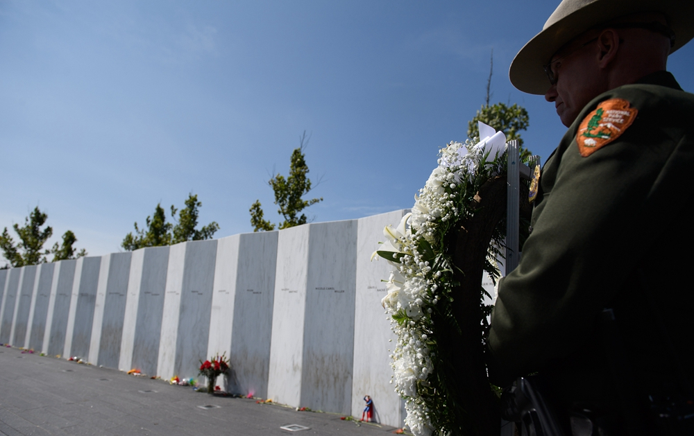 A National Park Service Ranger presents a wreath at the Flight 93 National Memorial in Shanksville, Pennsylvania, September 11, 2017. /VCG Photo