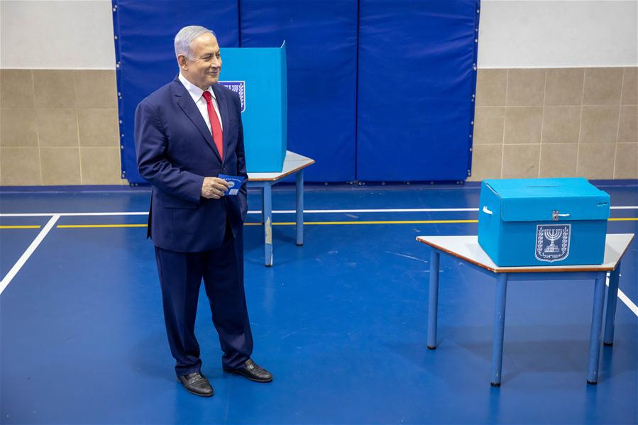 Israeli Prime Minister Benjamin Netanyahu casts his ballot at a polling station in Jerusalem, April 9, 2019. /Xinhua Photo