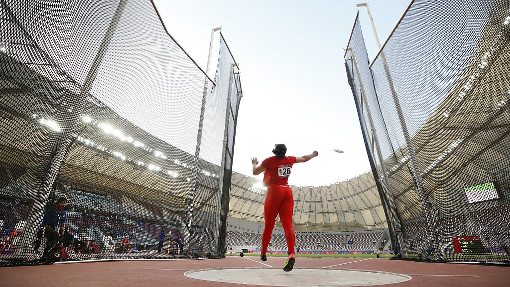 China's Feng Bin competes in the women's discus throw final, in which she claimed gold at the Asian Athletics Championships in Doha, Qatar, April 24, 2019. /VCG Photo