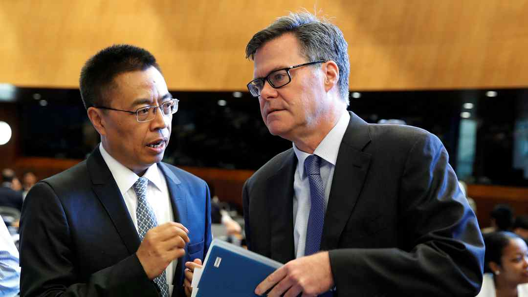 Dennis Shea (R), US Ambassador to the WTO talks with Zhang Xiangchen, Chinese Ambassador to the WTO, before the General Council meeting at the World Trade Organization (WTO) in Geneva, Switzerland, July 26, 2018./Reuters Photo