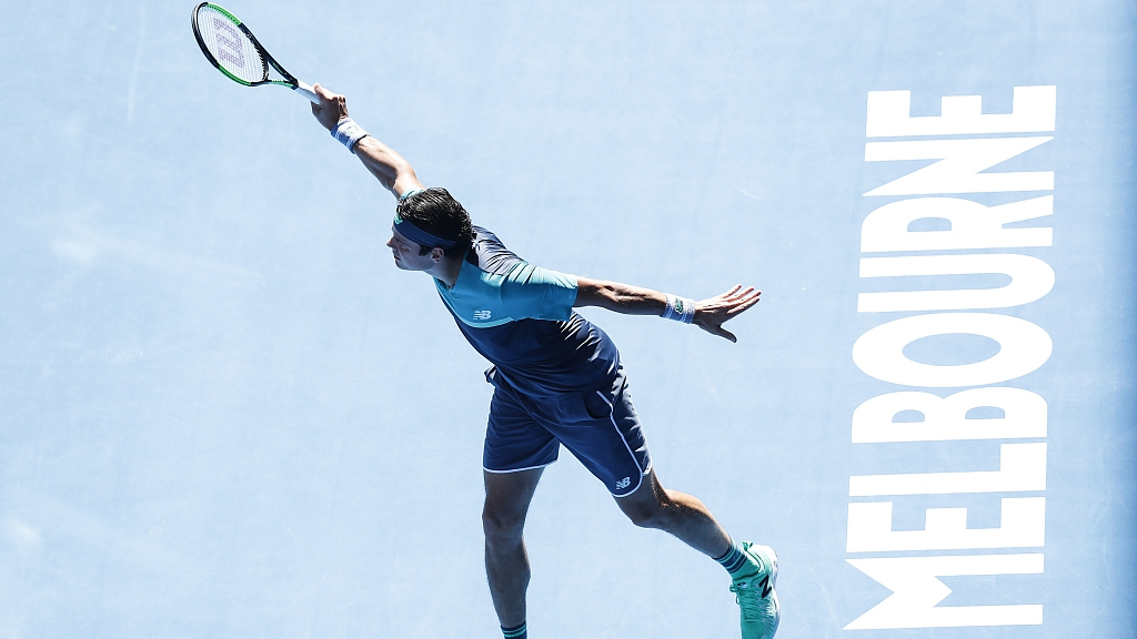 Milos Raonic of Canada plays a forehand in his fourth-round match against Alexander Zverev of Germany during day eight at 2019 Australian Open. /VCG Photo