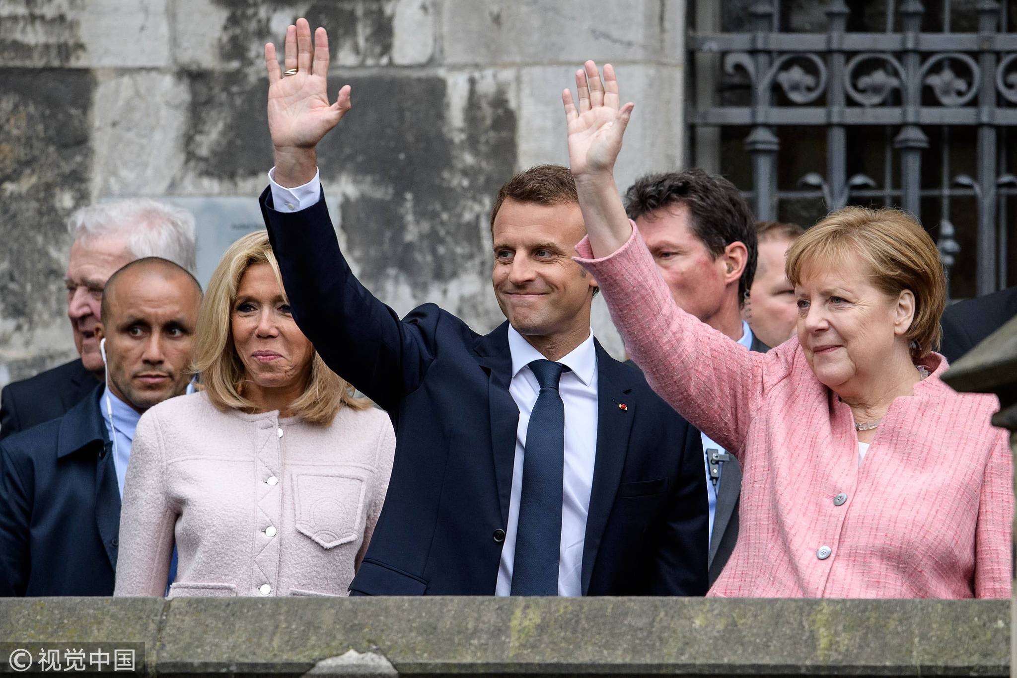 French President Emmanuel Macron and German Chancellor Angela Merkel attended the presentation of the International Charlemagne Prize to Aachen on May 10, 2018. /VCG Photo.