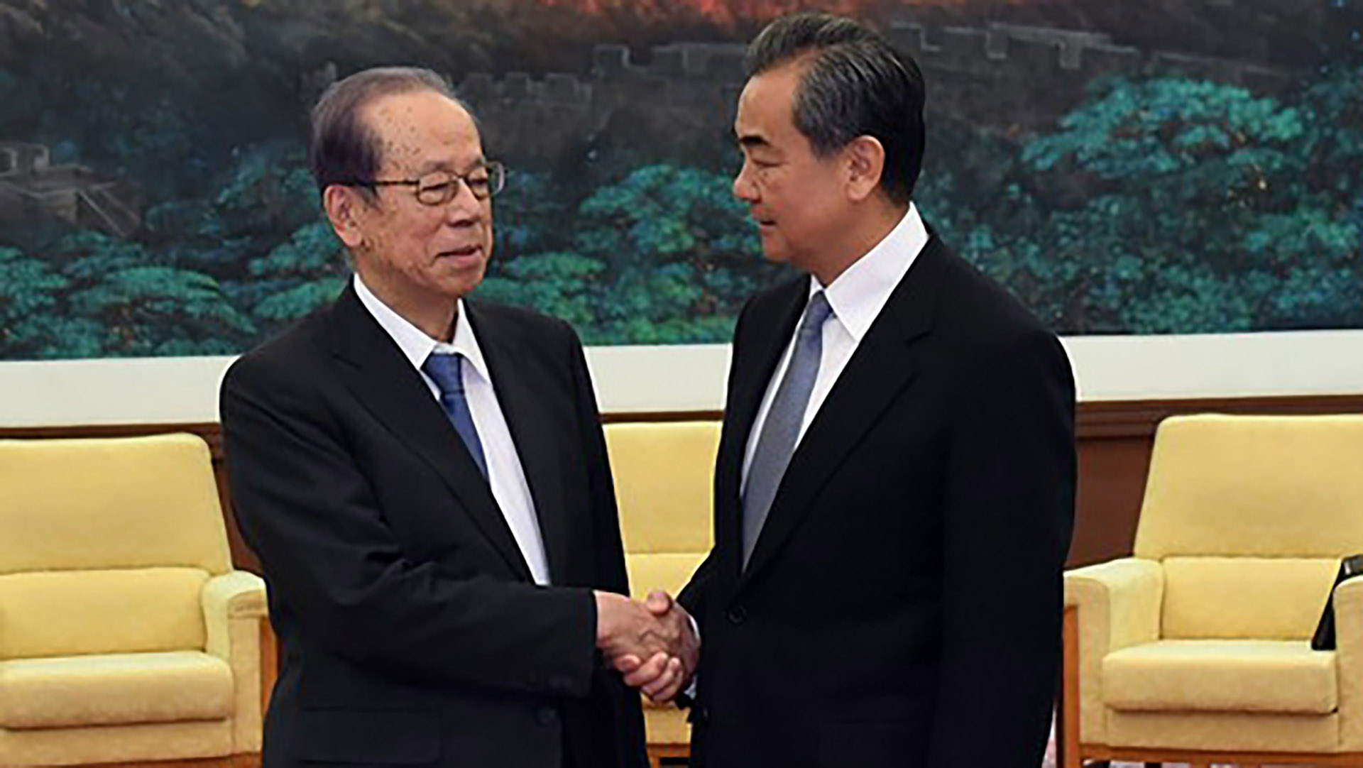 Chinese State Councilor and Foreign Minister Wang Yi speaks with former Japanese Prime Minister Yasuo Fukuda in Beijing, China, Oct. 10, 2018. /Photo via Chinese Foreign Ministry