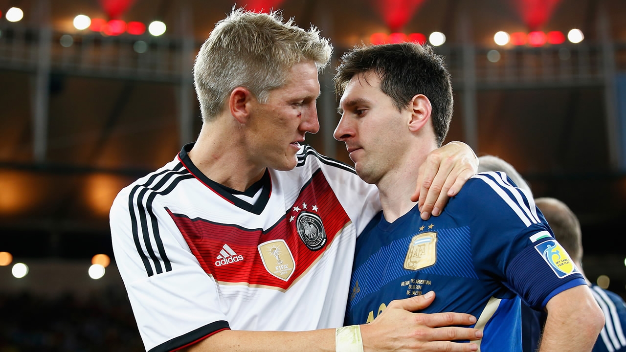 July 13, 2014: Bastian Schweinsteiger of Germany hugs Lionel Messi of Argentina after Germany's 1-0 victory in extra time during the 2014 FIFA World Cup Brazil Final match between Germany and Argentina at Maracana in Rio de Janeiro, Brazil. /VCG Photo