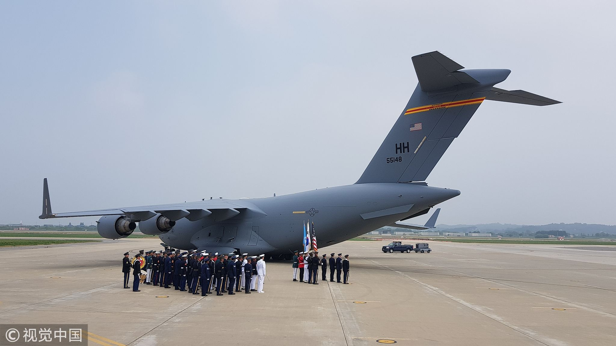 The C-17 Globemaster, a US Air Force transport aircraft, arrives at Osan Air Base in Pyeongtaek, about 70 kilometers south of Seoul, the Republic of Korea, July 27, 2018. /VCG Photo