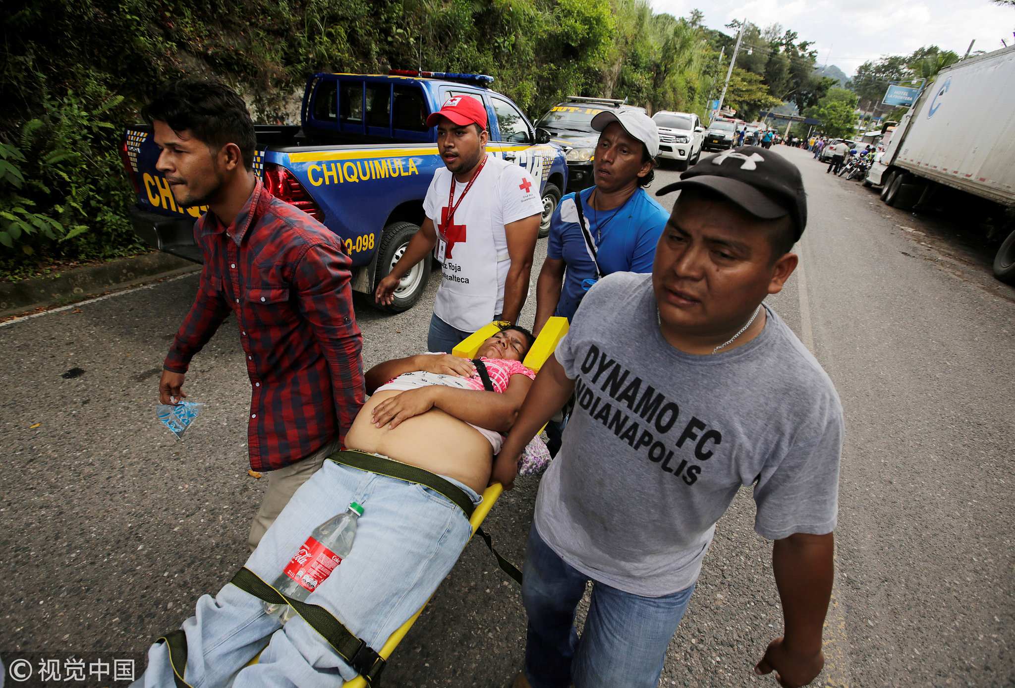 A Honduran migrant is helped after fainting at the border between Honduras and Guatemala, in Agua Caliente, Guatemala, October 15, 2018. /VCG Photo