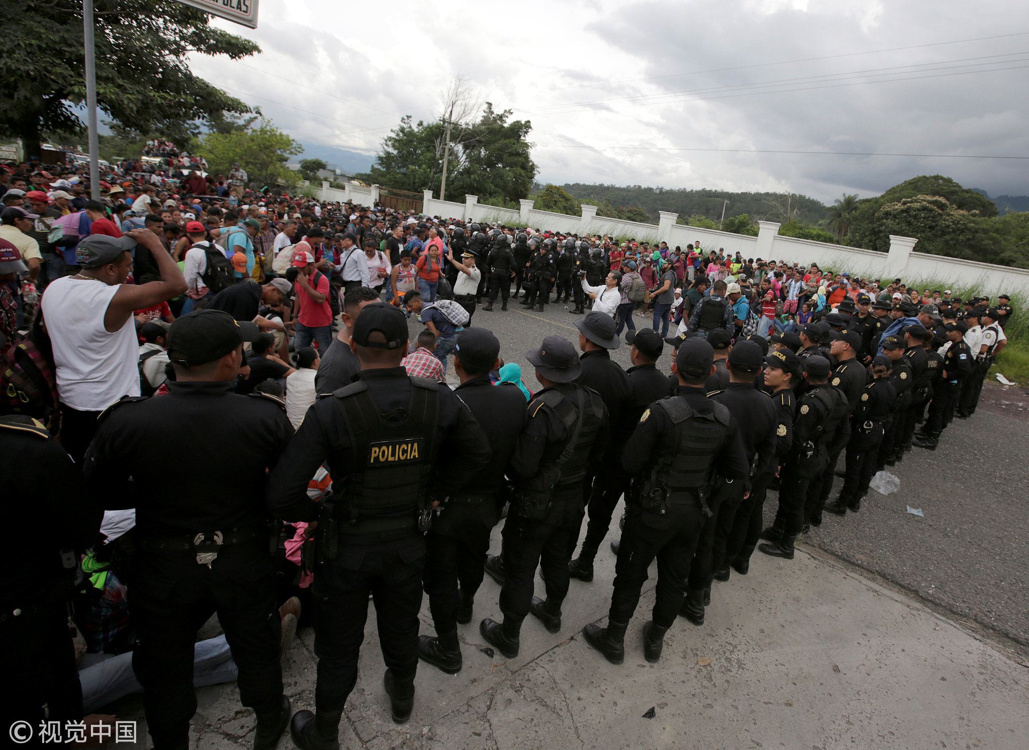 Guatemalan police officers watch as Honduran migrants arrive in Esquipulas city in Guatemala, October 15, 2018. /VCG Photo
