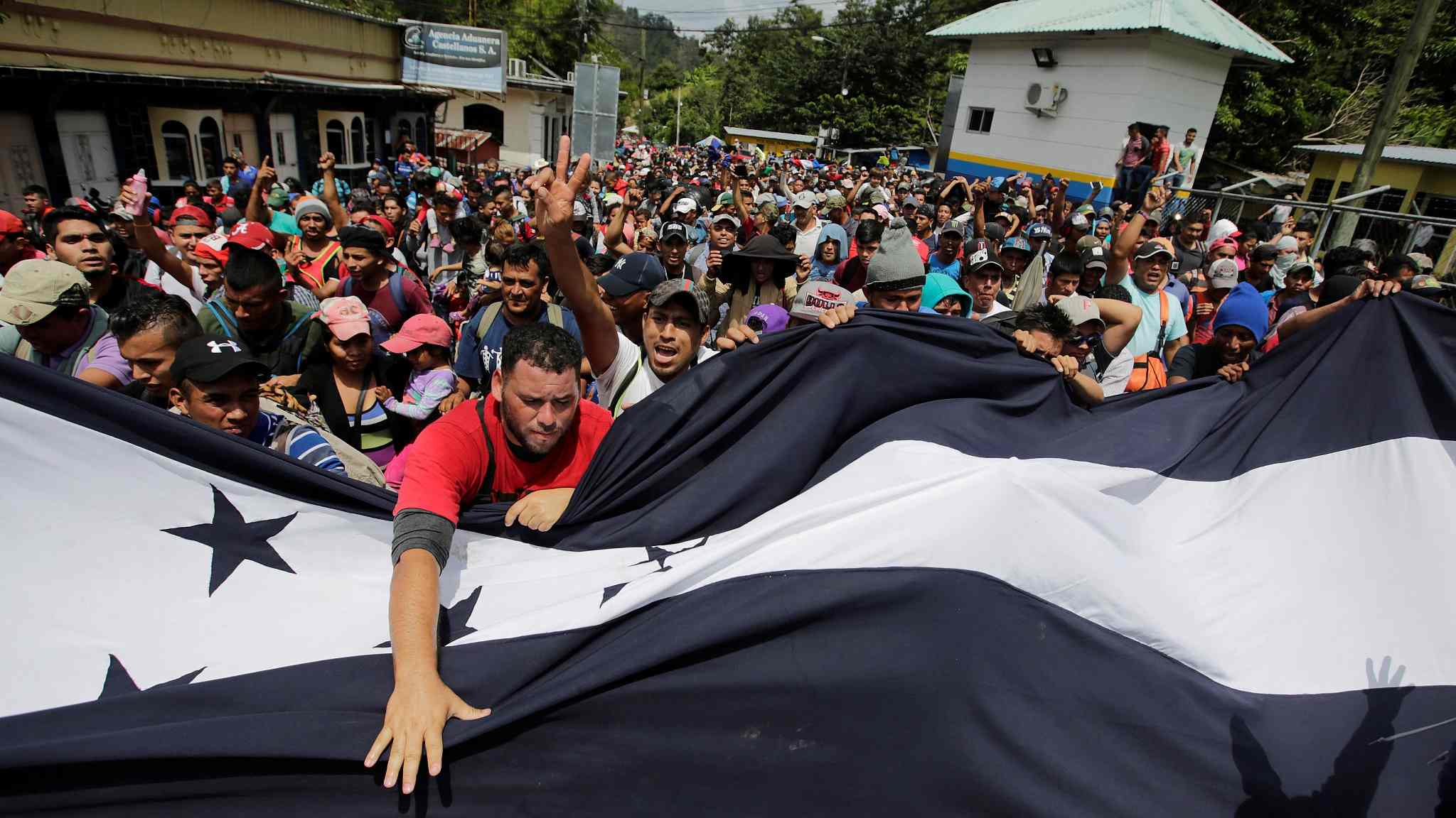Images show a group carrying backpacks and clogging roads near the border, some waving the Honduran flag.