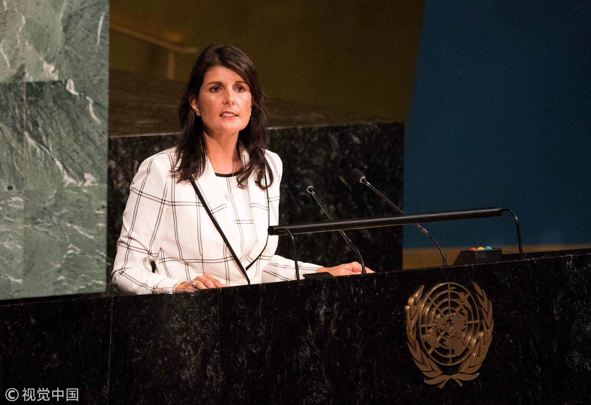 US Ambassador to the United Nations Nikki Haley speaks to the General Assembly before a vote, to deplore Israeli actions in Occupied East Jerusalem and the rest of the Occupied Palestinian Territory, in the General Assembly, June 13, 2018, in New York, US. /VCG Photo