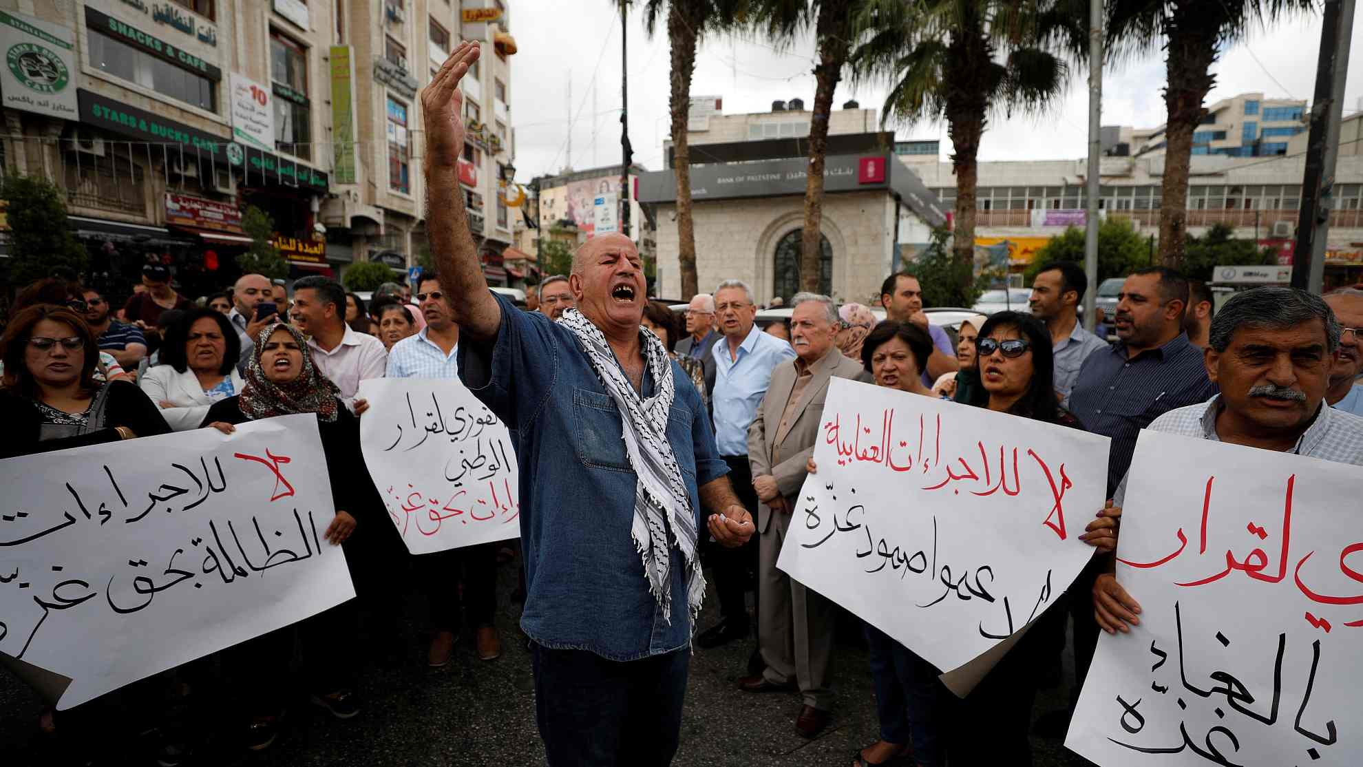 Palestinians take part in a protest demanding to lift the sanctions on Gaza Strip, in Ramallah, in the occupied West Bank, June 10, 2018. /VCG Photo