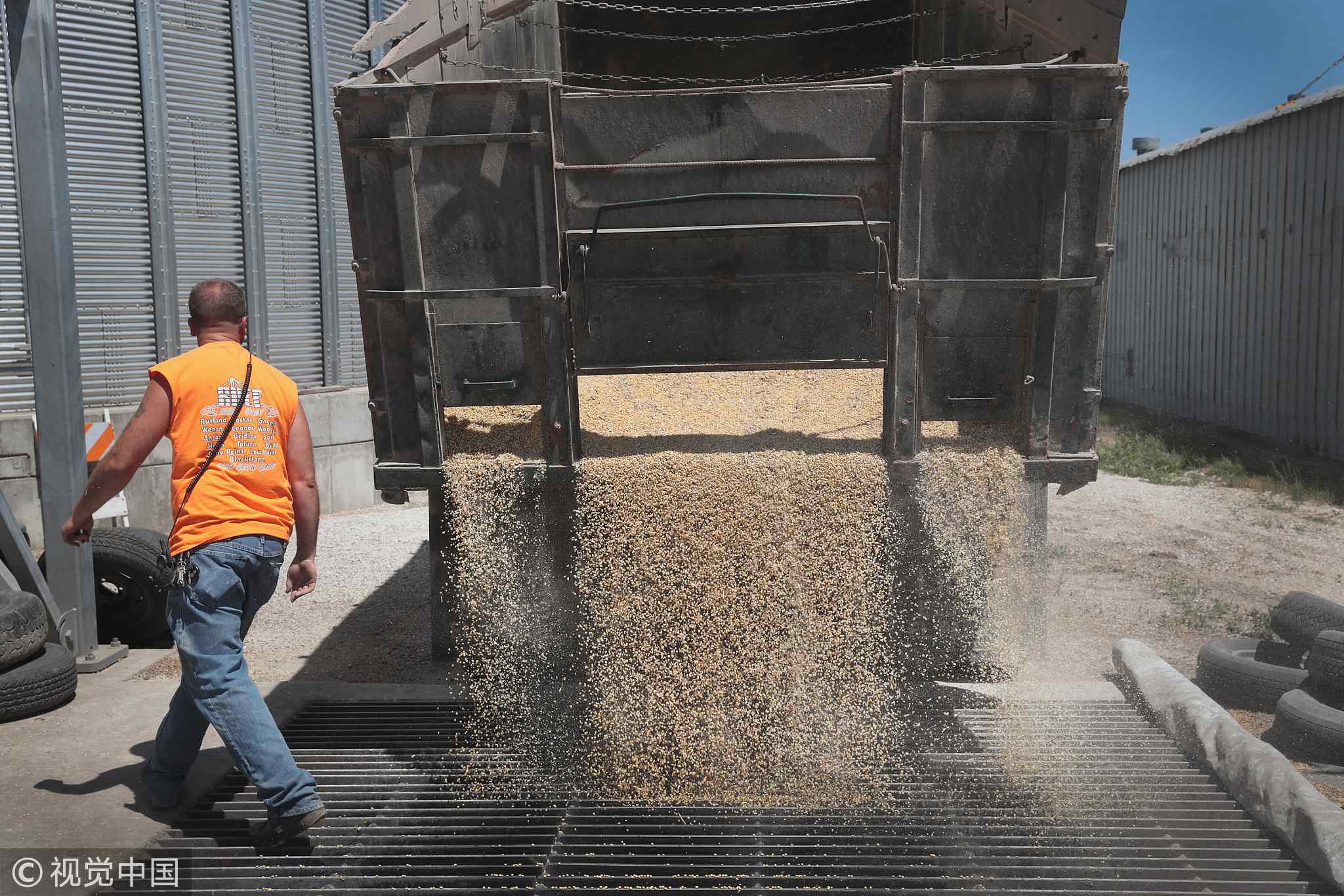Michael Kuster unloads soybeans at a Ruff Bros grain elevator in Blackstone, Illinois, US, June 13, 2018. /VCG Photo